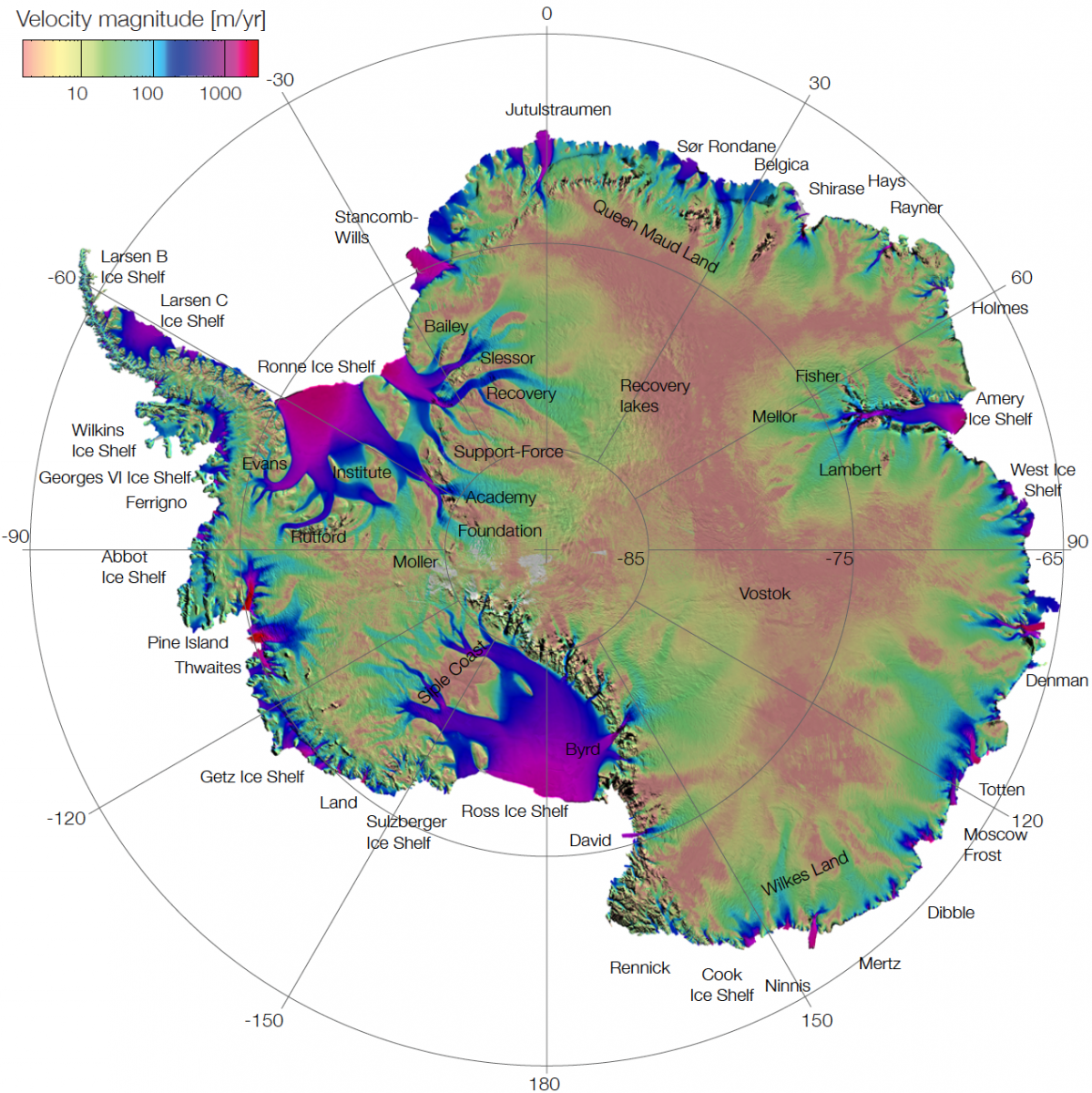 This sample image is from the MEaSUREs InSAR-Based Antarctica Ice Velocity Map (nsidc-0484) available from the NSIDC DAAC. This data product provides the first comprehensive, high-resolution, digital mosaics of ice motion in Antarctica assembled from multiple satellite interferometric, synthetic-aperture radar systems. — Credit: AIV