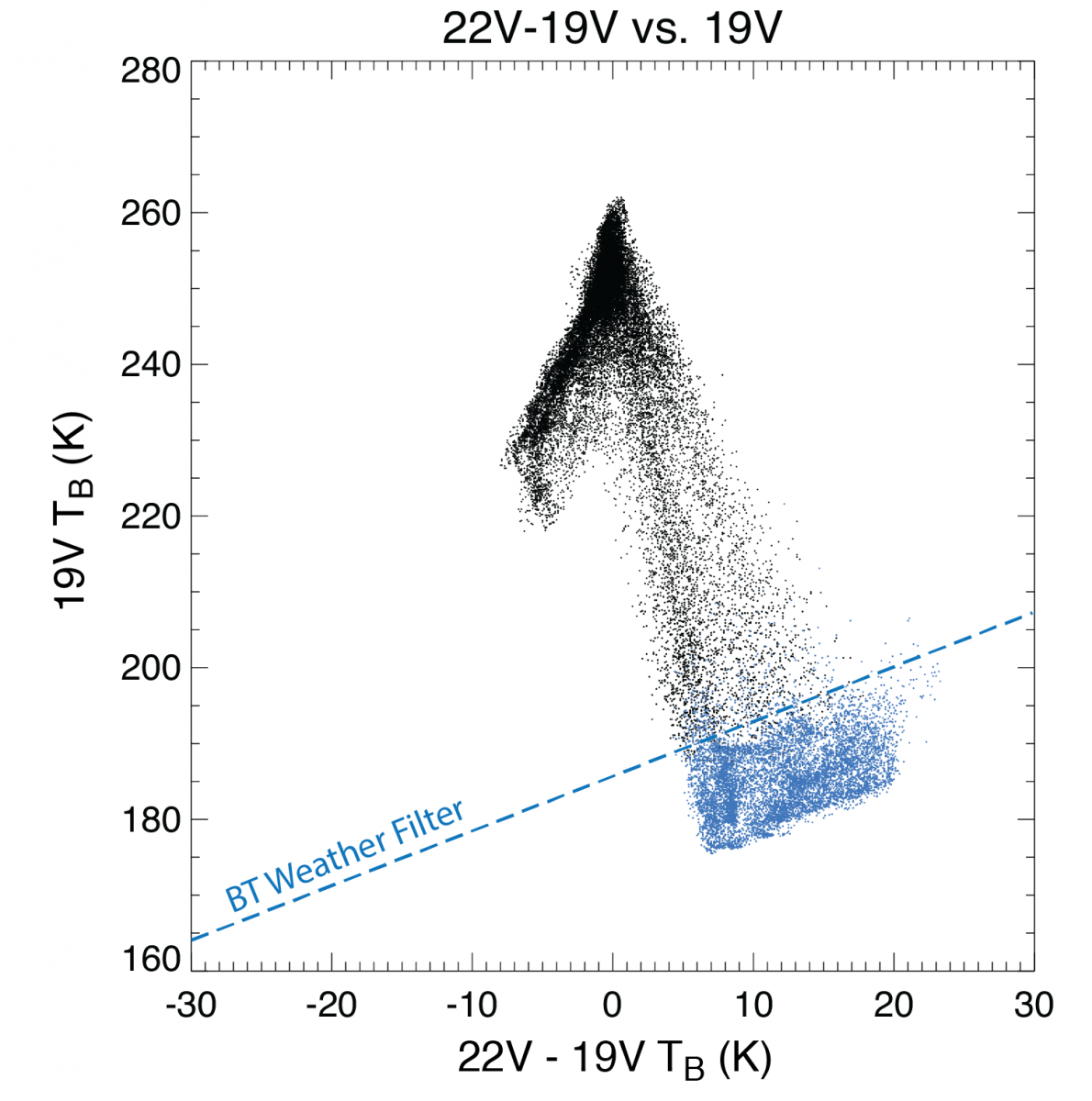 The Bootstrap algorithm uses a filter to identify areas where weather-related effects might have affected sea ice concentration estimates. This weather filter is also based on interpolation between clusters of known Tb observations and incorporates observations from an additional channel: 22V. The figure below demonstrates how the V19/V22-V19 and V19/V37 scatterplots can be used to identify areas of spurious estimates.