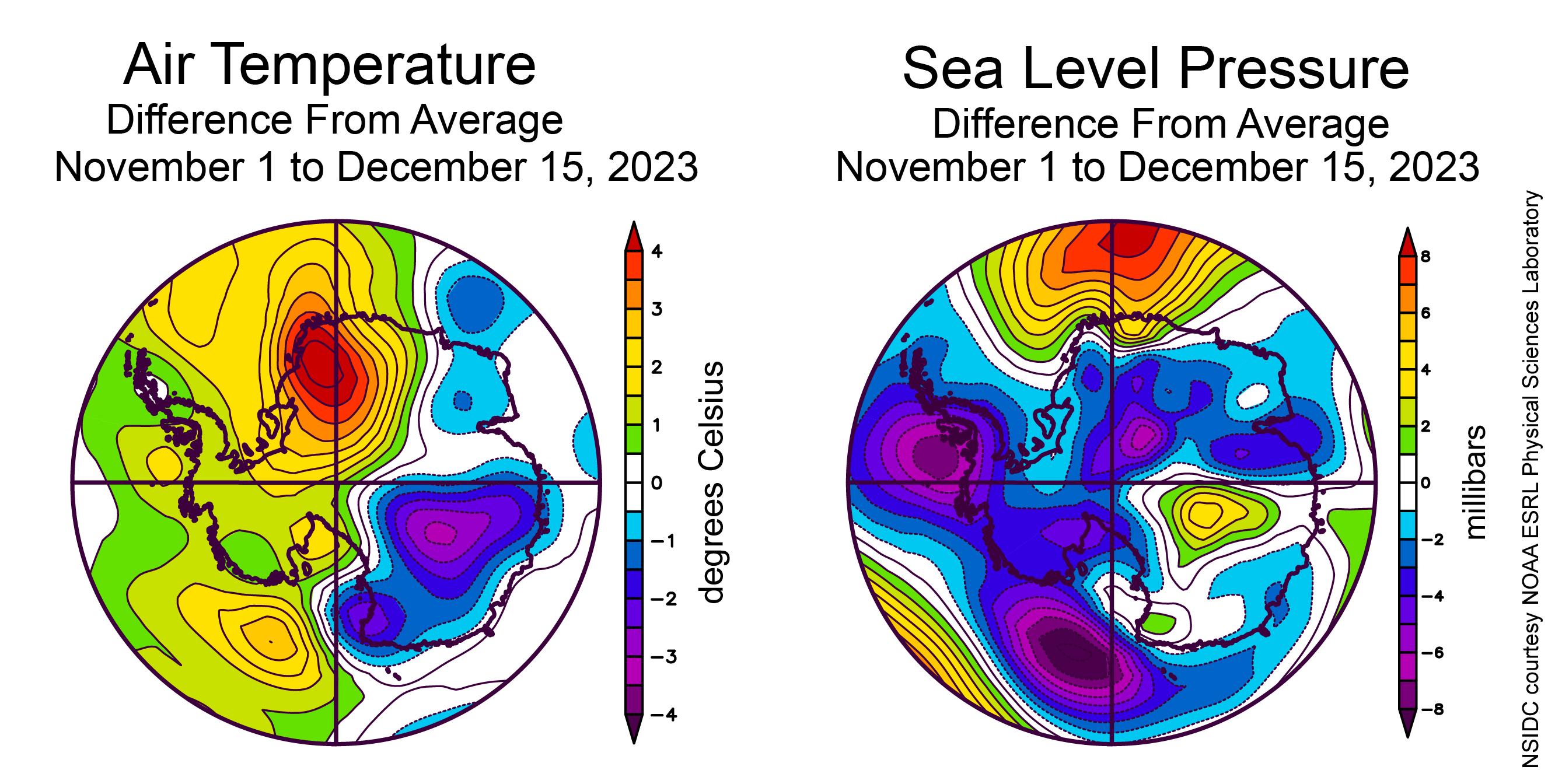 Figure 2. The plot on the left shows the departure from average air temperature in Antarctica at the 925 hPa level, in degrees Celsius, for November 1 to December 15, 2023. Yellows and reds indicate above average temperatures; blues and purples indicate below average temperatures. The plot on the right shows the departure from average sea level pressure in Antarctica in millibars for the same time period. Yellows and reds indicate above average air pressures; blues and purples indicate below average air pressures. — Credit: NSIDC courtesy NOAA Earth System Research Laboratory Physical Sciences Laboratory