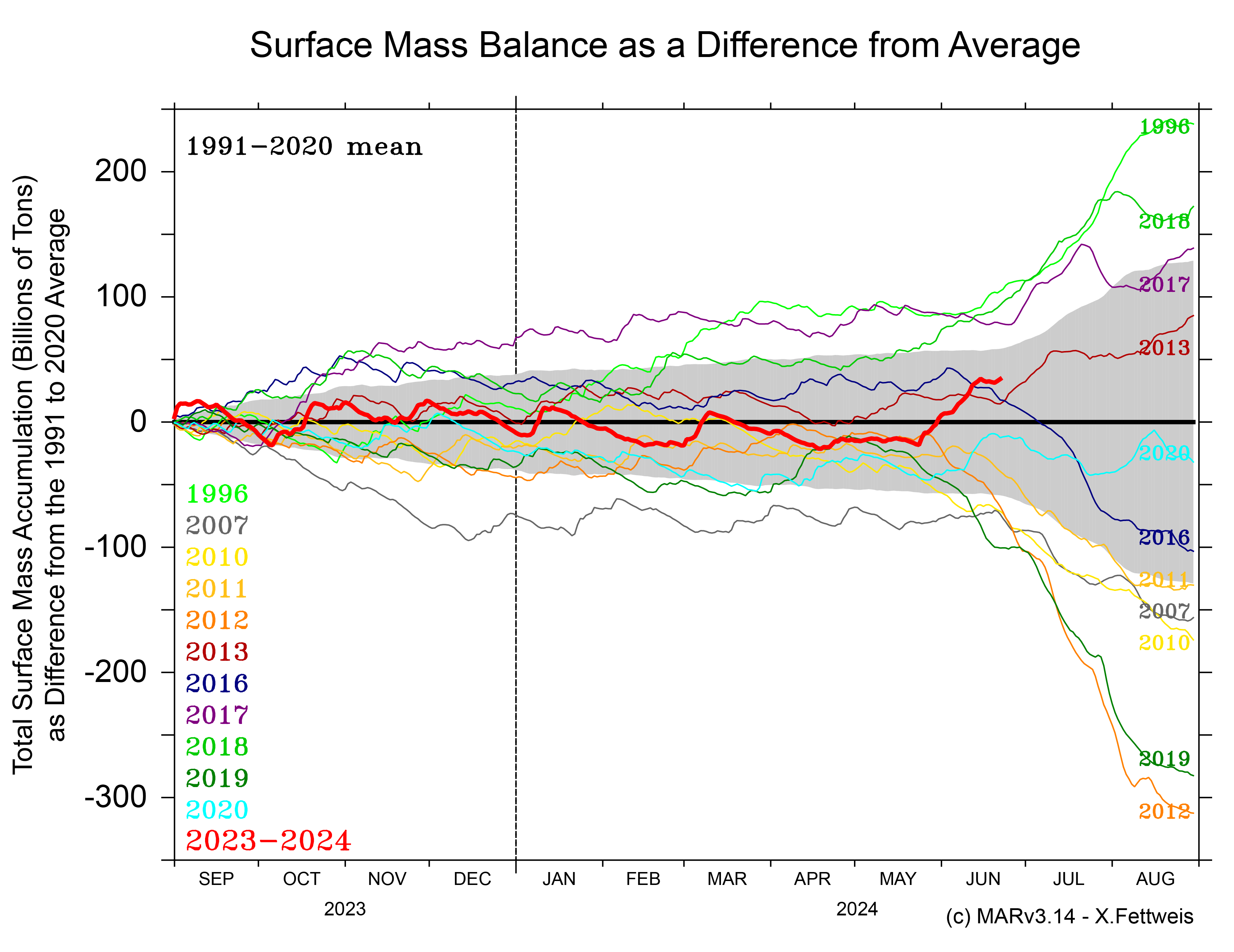 Net snow accumulation (total snow and rain, minus evaporation and run-off of melt) has been mostly above average all autumn and winter, and a late snowfall event in early June has added fresh snow to the snowpack at the start of the melt season (Figure 2b). The late snow cover is along the south and west coast, extending northward and over the northern third of the island (Figure 2c). Particularly for the southwestern coast, this late snow will delay the emergence of darker, older ice, and therefore delay increased melting and runoff over this dark surface.