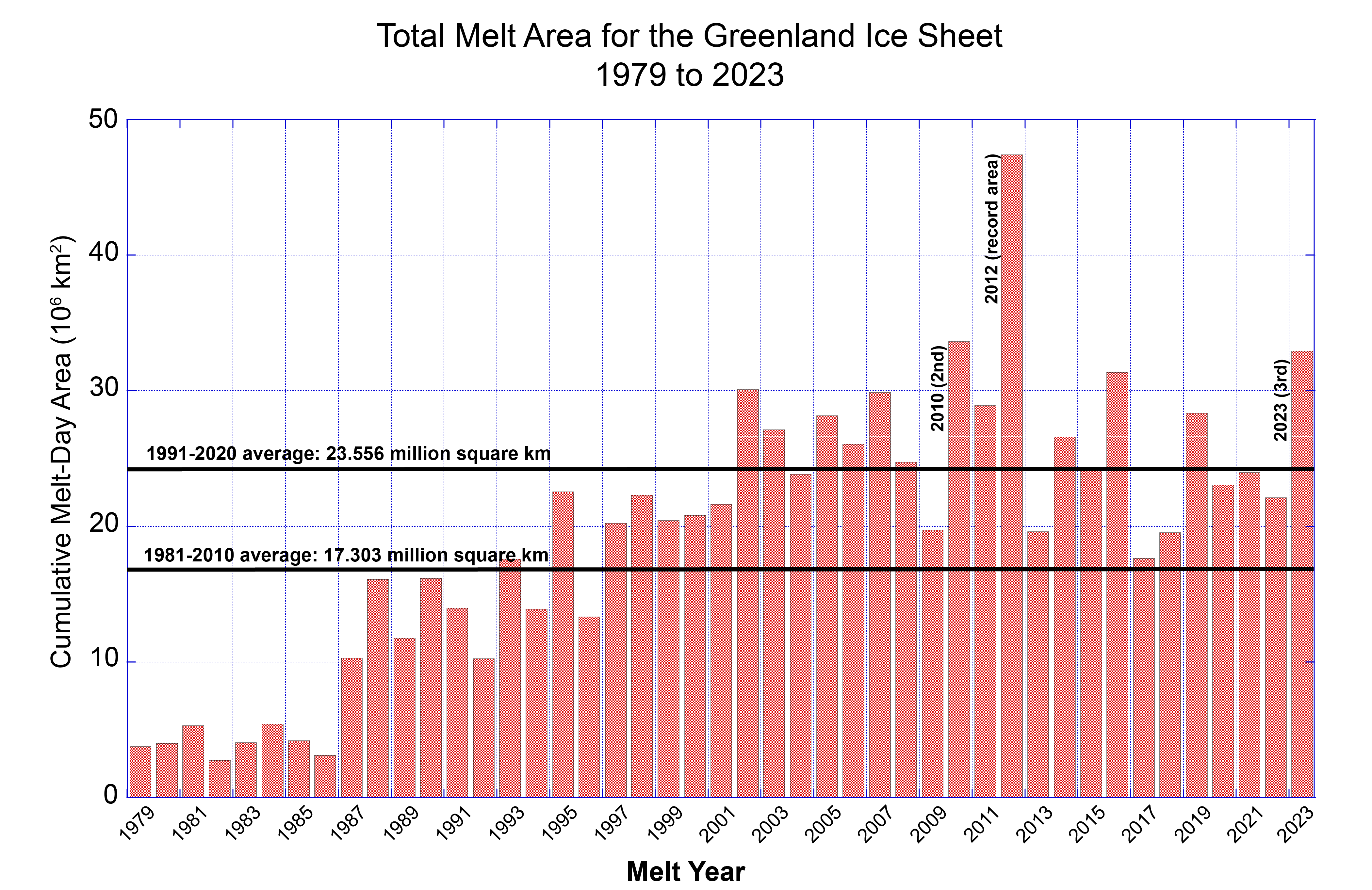 Greenland melting reached an extreme maximum in the summer of 2012, far surpassing anything that had been seen in the satellite record or in any historical observations at that time. In that single year, nearly every part of the Greenland Ice Sheet saw significant surface melting, even high-elevation areas that had been assumed to be permanently free of surface melting. This was referred to as the dry snow zone in the late 1960s.