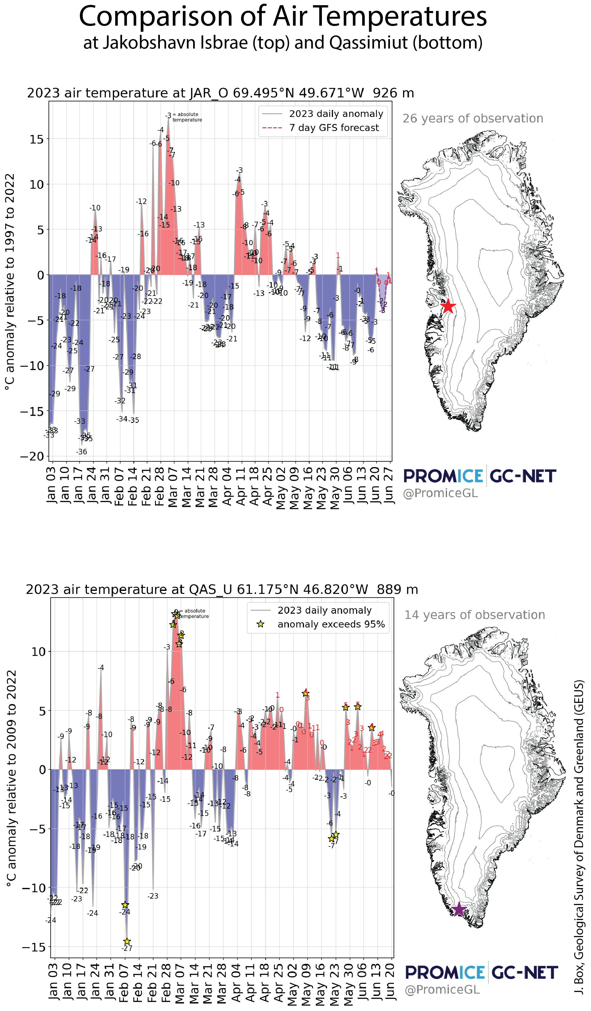 Air temperatures for the potentially over-estimated melt area discussed above has been below freezing for the entire May to June period, with a maximum temperature of -0.9 degrees Celsius (30 degrees Fahrenheit) (Figure 5). As of this post, extensive melting has now reached the area. A comparison of the difference from average conditions for two regions through June 20 indicates that the area near Jakobshavn Isbrae has had below temperatures since about May 10, whereas Qassimiut has had above average temperatures since mid-February (Figure 6).