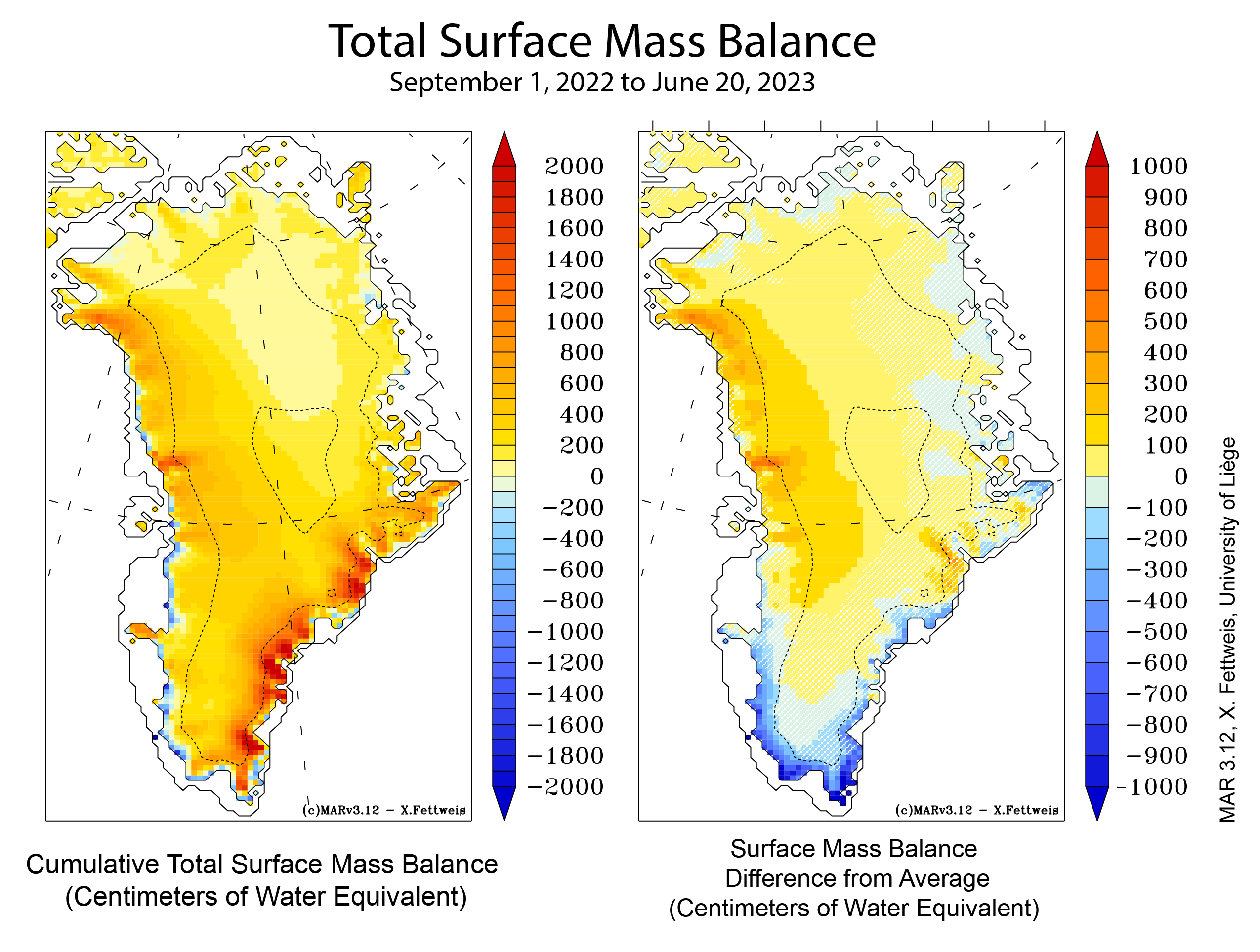 Air temperatures near the southern tip of Greenland have been 1 degree Celsius (2 degrees Fahrenheit) above average, but temperatures elsewhere on the island have been at or below average (Figure 2). The Summit area and northward have recorded temperatures about 1.5 degrees Celsius (3 degrees Fahrenheit) below average. Winds from the north along the western coast of the island brought cooler conditions, driven by generally low air pressure centered on Greenland’s north coast. The slightly warmer conditions and more frequent melting along the southern and southeastern coast were a result of winds coming from the south over that region. Total surface mass balance, which at the beginning of the melt season is mostly winter snowfall accumulation, is now slightly above the 1981 to 2010 reference period by about 50 billion tons (Figure 3). However, winter snowfall accumulation has been below average along the southern coastal area, by as much as 800 millimeters (32 inches) of water equivalent (Figure 4). Along the western coast, snowfall accumulation is above average. Combined with the cool conditions, thicker accumulated winter snowpack may slow the progression of melt in this otherwise high melt area of the ablation, or exposed ice and run-off, region. With persistent winter snowfall, the surface remains bright longer, and therefore reflects more of the incoming sunlight. However, along the entire southern coast, lower winter snowfall followed by above average surface melt will promote increased runoff as the melt season progresses.