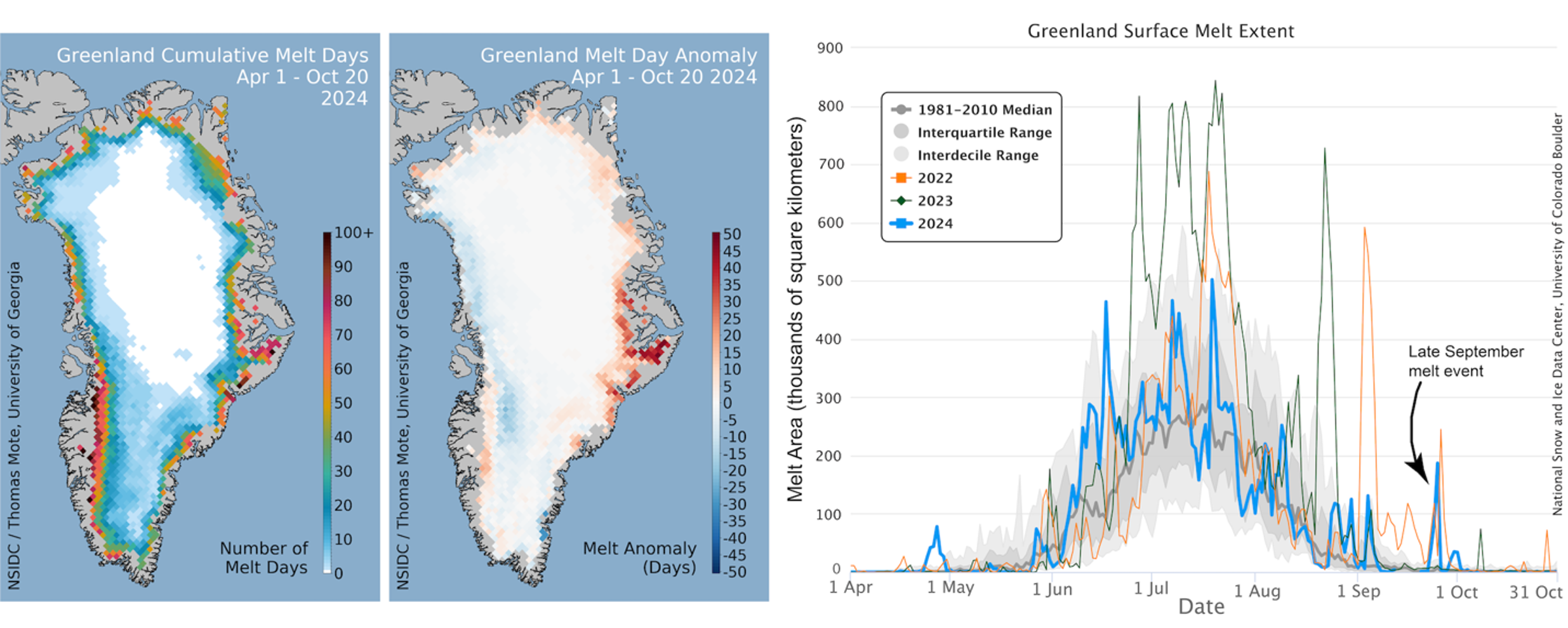 September was a partial exception to the generally cool summer for Greenland in 2024, and a moderate spike in melt extent beginning on September 21 ended the season dramatically (Figure 1a, right). An intense high-pressure system in southern Baffin Bay drove warm air from central Canada onto the northwestern part of the ice sheet, causing extensive melting very late in the season. Temperatures soared to more than 10 degrees Celsius (18 degrees Fahrenheit) above average as the event began, and air temperatures in the following three days were as much as 18 degrees Celsius (32 degrees Fahrenheit) above average over the highest parts of the ice sheet. Still, temperatures did not reach the melting point at that altitude because of the lateness of the event and the onset of autumn. While the event was an extreme surge in temperature, snow and rain precipitation associated with the influx of warm and wet air mass suppressed the impact on SMB as a large part of meltwater was absorbed by snow and snowfall accumulation was larger than meltwater runoff during this event.