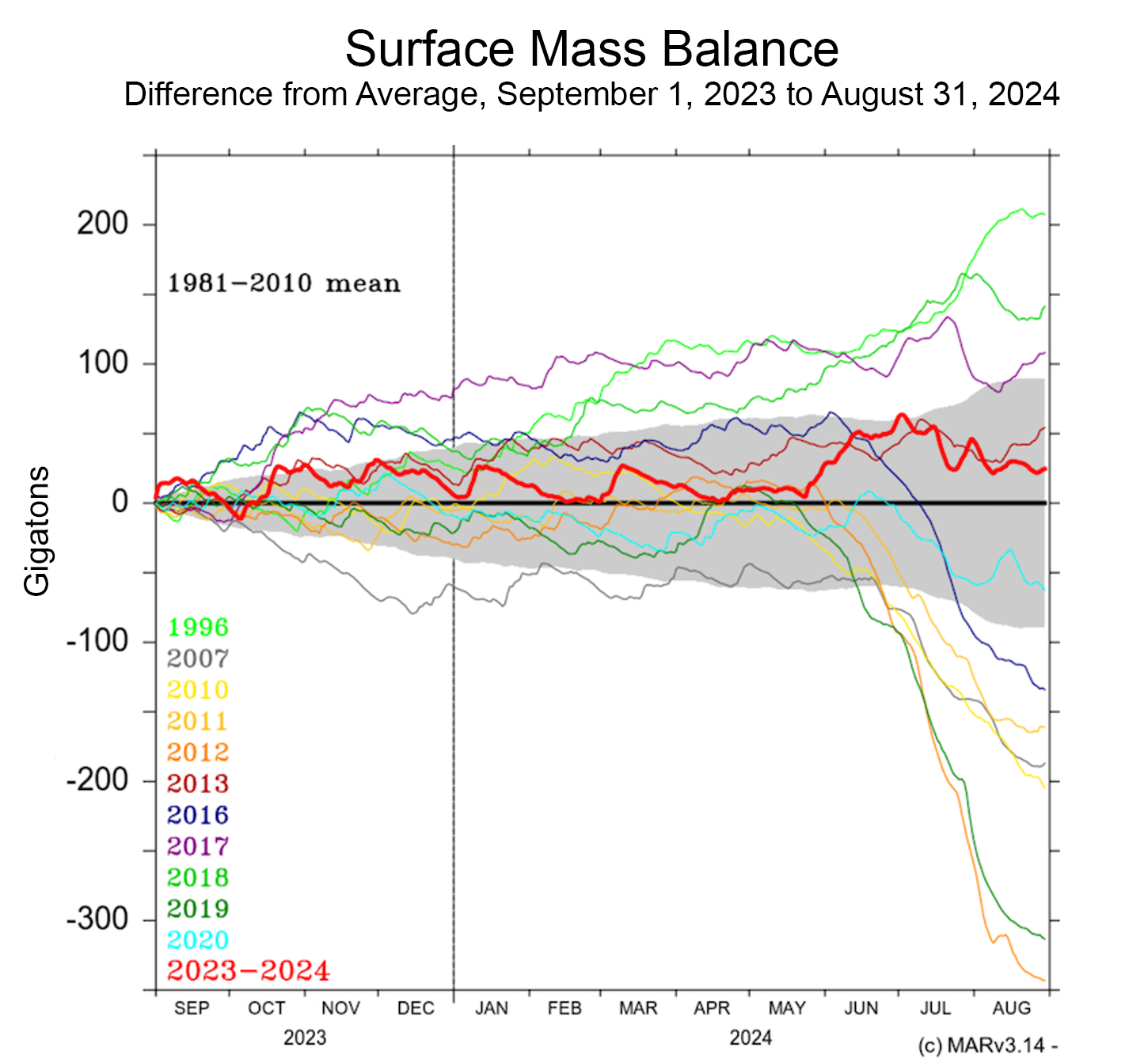 The surface mass balance (SMB), or the total amount of snow and rain minus evaporation and meltwater runoff, remained above average for the entire summer, owing to frequent snowfalls through the season (Figure 2b). Greenland ended the 2023 to 2024 water cycle, which is calculated from September 2023 to August 2024, with a net increase in surface mass. Ice Sheets Today calculates the annual cycle from November to October to capture late-season events, which generally do not lead to runoff. However, faster glacier flow—a consistent feature of the ice sheet since the early 2000’s—will lead to a net loss of ice for the year. So far in the 2024 to 2025 water cycle, which is calculated from November 2024 to October 2025, Greenland’s net snowfall is near average.