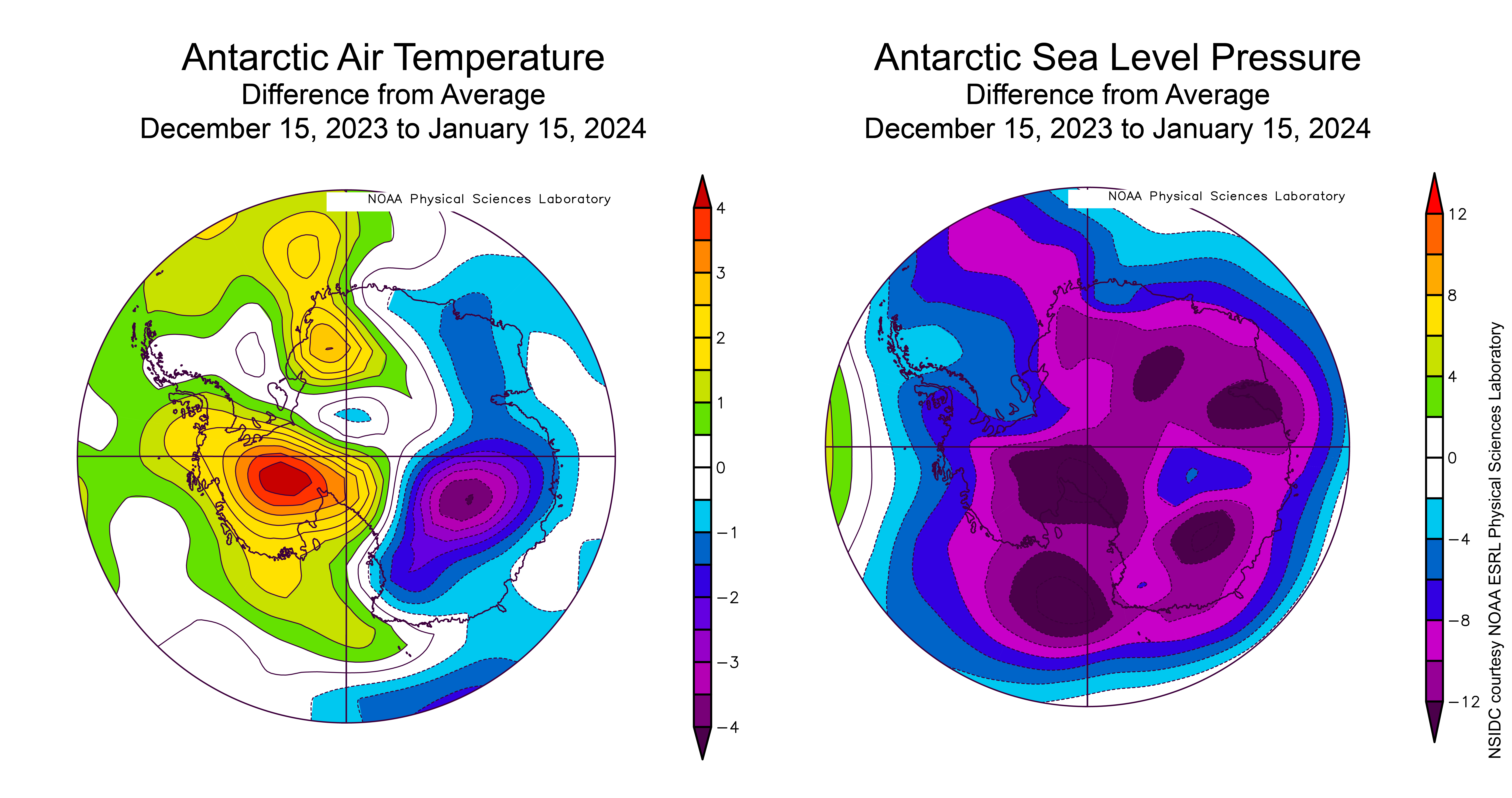 Weather conditions for the mid-December to mid-January period were warm in central West Antarctica, where air temperatures at 925 millibars level (about 2,500 feet above sea level) were up to 4 degrees Celsius (7 degrees Fahrenheit) above the 1991 to 2020 average, with somewhat lower temperatures extending to the Bellingshausen Sea coast and along the Peninsula of 1 to 2 degrees Celsius (2 to 4 degrees Fahrenheit) above average. By contrast, most of East Antarctica had temperatures 3 to 4 degrees Celsius (5 to 7 degrees Fahrenheit) below average. Atmospheric pressure for the same period was below average over most of the continent, a condition that creates strong westerly winds just outside of the coast of Antarctica and across the Peninsula. Consistent with this, the Southern Annular Mode index was persistently in a moderate to strong positive phase for December and January.