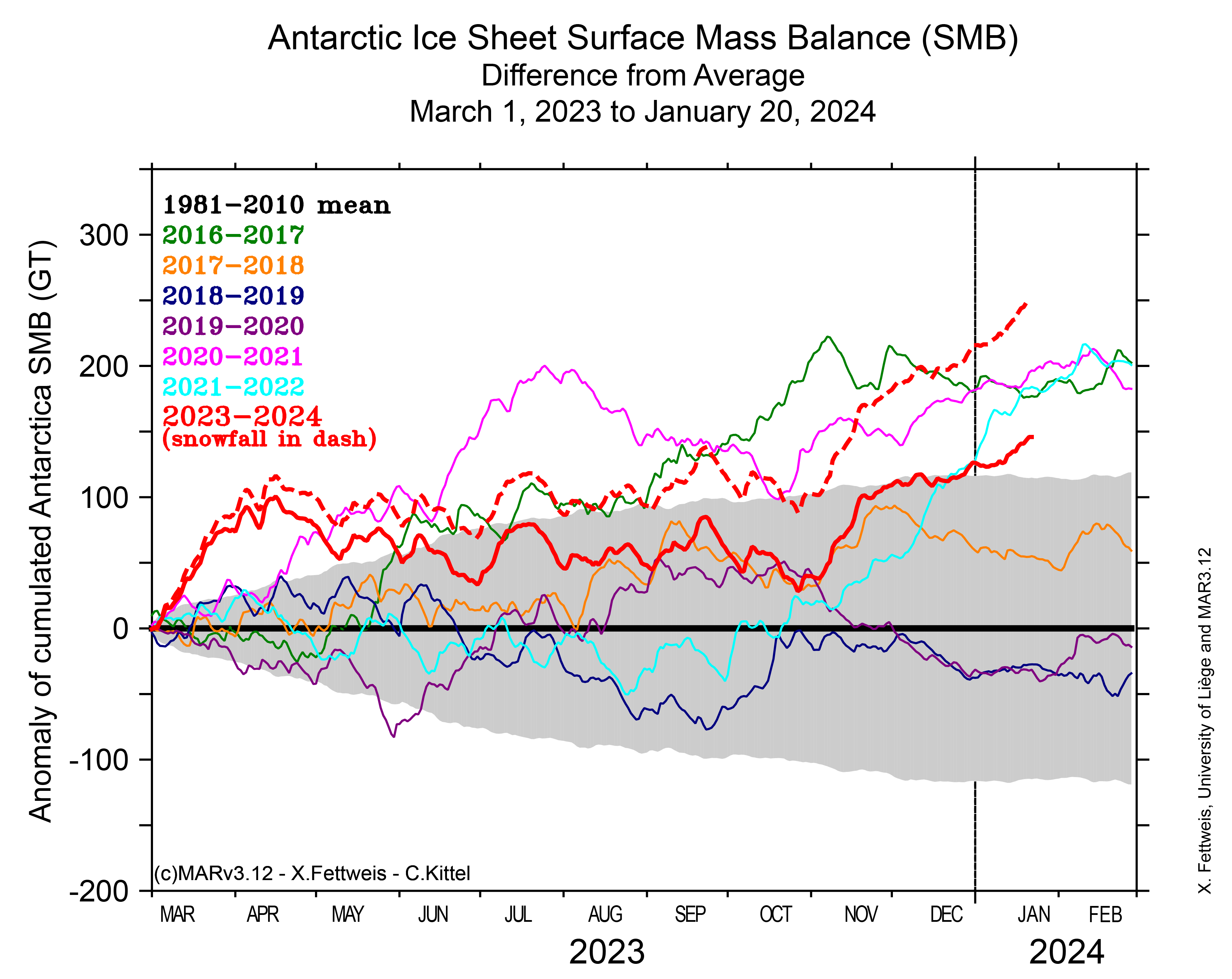 Antarctic climate models, based on real weather data and re-analysis of conditions across the continent, now indicate below average snowfall over the ice shelves on both side of the Peninsula, while the crest of the Peninsula remains well above average. This is a result of strong dry winds in the region coming off the high ridges. In western Queen Maud Land, total net snow accumulation is well above average over a large region, bringing the snow input total since March 2023 to about 150 billion tons above average. Parts of the western Queen Maud Land coast had up to 50 centimeters (20 inches) water equivalent more net water input (almost entirely as snow). A more widespread region extending high up onto the East Antarctic Plateau had about 5 centimeters (2 inches) above average. However, much of the West Antarctic coast near the Amundsen Sea, from Pine Island Bay to the Getz Ice Shelf, and the Wilkes Land coast of East Antarctica, had below average accumulation.