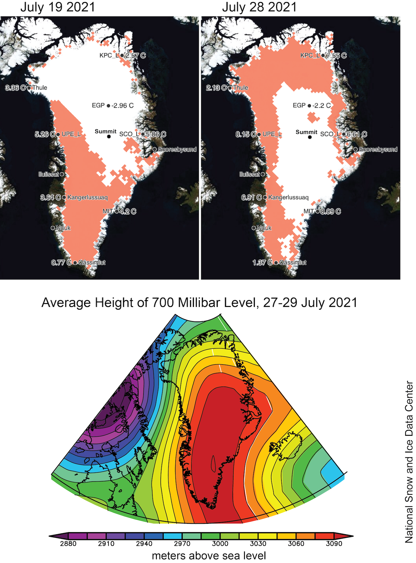 The peak melt extents for the 2021 Greenland melt season occurred on July 19 and July 28. On the July 19 about 700,000 square kilometers (270,000 square miles) or 40 percent of the ice sheet experienced melt. On July 28, about 880,000 square kilometers (340,000 square miles) or 54 percent of the surface melted. Temperatures measured at several weather stations from the Programme for Monitoring of the Greenland Ice Sheet (PROMICE) recorded above-freezing temperatures along the entire coastal ice edge region on both peak days, with the exception of the high-elevation East Greenland Ice-core Project station, which showed temperatures in the -2 to -3 degrees Celsius (28 to 27 degrees Fahrenheit) range at mid-day, approximately 10 degrees Celsius (18 degrees Fahrenheit) above average. At summit, the highest point on the ice sheet at 3,216 meters (10,551 feet) above sea level, air temperatures reached -1.6 degree Celsius (29 degrees Fahrenheit) on July 19 and -0.7 degrees Celsius (30.7 degrees Fahrenheit) on July 28. The summit area had no surface melting. These numbers are preliminary and were provided by the National Oceanic and Atmospheric Administration Global Monitoring Laboratory. An atmospheric river of warm air drove the second melt area peak on July 28. Weather conditions were guided by the strong pressure gradient between a high-pressure area that moved northwestward from the Denmark Strait (between Greenland and Iceland) and a persistent low-pressure area over the Canadian Arctic archipelago. The event started with snow and rain in the northwest coast, but associated warm conditions caused extensive melting over much of western and northern Greenland in the succeeding days. Over most of the ice sheet, meltwater percolates into remaining snow and refreezes; however, in bare ice and water-saturated snow areas near the coast, meltwater runoff occurs. While the overall amount of runoff has been reduced by repeated snowfall events through June and July, the July 28 event (-12.5 billion tons) was the third-highest daily ablation (negative SMB) rate, after July 11, 2012 (-12.9 billion tons) and July 31, 2019 (-16.1 billion tons).