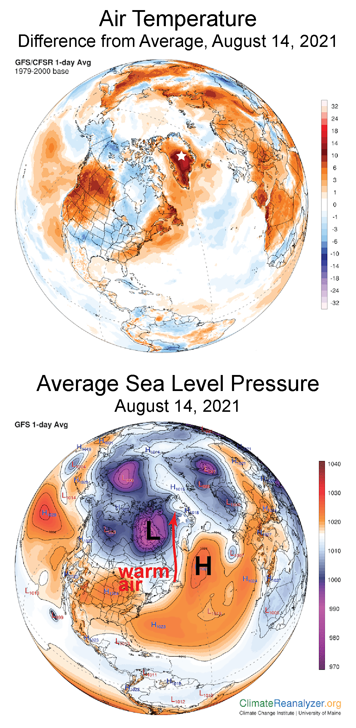 On August 14, 2021, rain was observed at the highest point on the Greenland Ice Sheet for several hours, and air temperatures remained above freezing for about nine hours. This was the third time in less than a decade, and the latest date in the year on record, that the National Science Foundation's Summit Station had above-freezing temperatures and wet snow. There is no previous report of rainfall at this location (72.58°N 38.46°W), which reaches 3,216 meters (10,551 feet) in elevation. Earlier melt events in the instrumental record occurred in 1995, 2012, and 2019; prior to those events, melting is inferred from ice cores to have been absent since an event in the late 1800s. The cause of the melting event that took place from August 14 to 16, 2021, was similar to the events that occurred this late July, where a strong low pressure center over Baffin Island and high air pressure southeast of Greenland conspired to push warm air and moisture rapidly from the south.