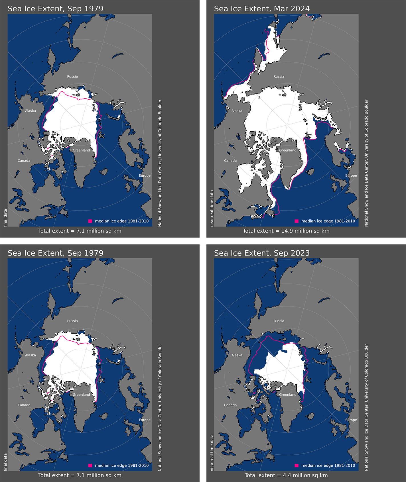 In both the Arctic and Antarctic, sea ice extent increases in the autumn and winter, and decreases in the spring and summer. Sea ice extent changes so much throughout the year that any comparison of sea ice extent between years is only meaningful if the comparison is made at the same time of year. It would be like saying that in the Northern Hemisphere, the average temperature in January 2024 was lower than the average temperature in August 1994. It’s comparing two very different seasons (and ignoring the fact that annual global temperature overall is quickly rising).