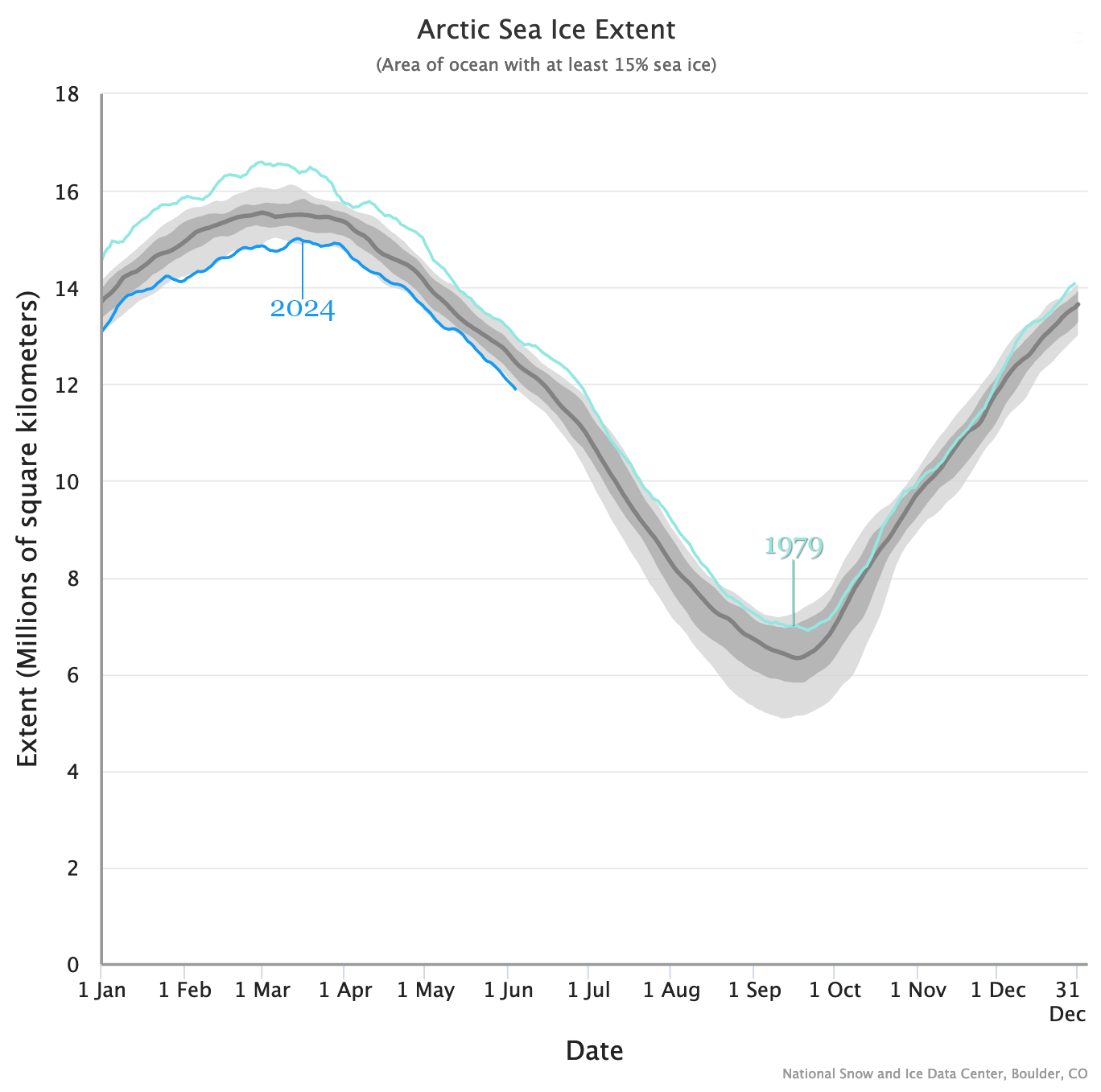 Using NSIDC’s Charctic tool, you can follow sea ice extent (the area of ocean with at least 15 percent sea ice concentration) over the course of the satellite record. The Charctic graph displays months of the year along the horizontal axis and extent (in millions of square kilometers) along the vertical axis. Every year gets its own, individual extent line.