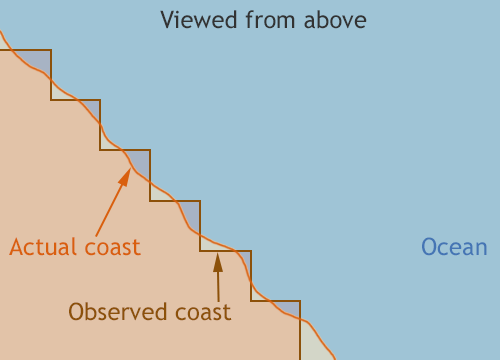 NSIDC relies on passive microwave data to compile sea ice maps. Passive microwave sensors have the advantage of being able to see through the Arctic’s cloudy weather and capture surface data even during long, dark winters, making them ideal for tracking sea ice. The disadvantage, however, is that passive microwave sensors often have low spatial resolution. The sensors collect data in “footprints” that are up to 50 to 70 kilometers (31 to 44 miles) in diameter. Out on the open ocean, for instance, most of these large footprints include only water; inland, most include only land. But along the coasts, footprints often contain both land and water.