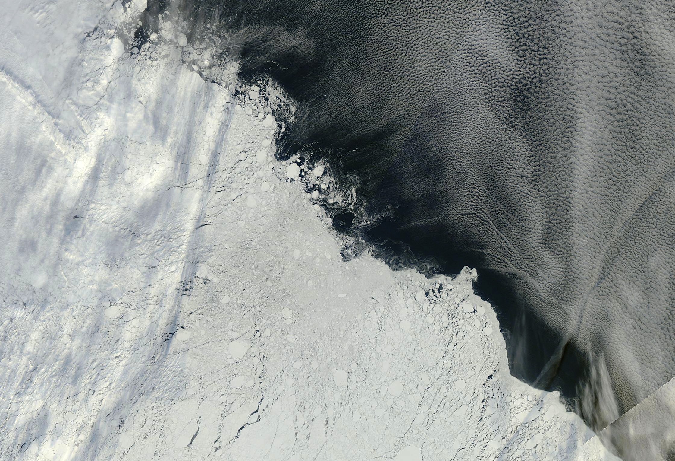 Meier and other scientists can also use high-resolution sensors when they need to zoom in and verify where sea ice is—or is not. One of these options is the Multisensor Analyzed Sea Ice Extent (MASIE) project, which includes data with resolution as fine as 4 square kilometers (1.5 square miles). The National Oceanic and Atmospheric Administration (NOAA) supports the project. “For knowing where there is ice now in specific locations, it is a more useful resource than passive microwave,” said Meier. However, because MASIE includes a mix of sources and is subject to human analysis, it does not provide the consistent record that passive microwave sensors do.