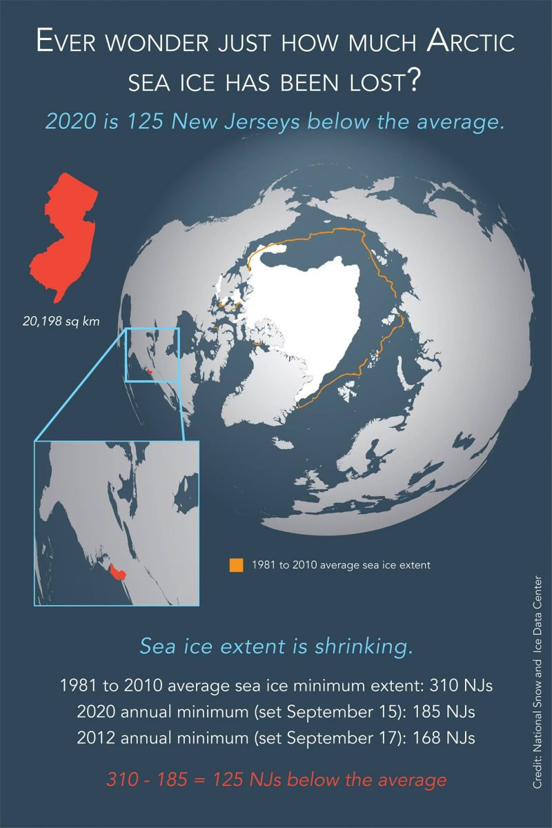 Arctic sea ice loss since the start of the satellite record can be measured in myriad ways. At the time of the 2020 September minimum, NSIDC staffers realized that sea ice extent was 125 New Jerseys below the 1981 to 2010 average. — Credit: Agnieszka Gautier, NSIDC