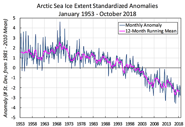 By the 1950s, shipping charts were regular and extensive enough to comprise a robust data set covering the Arctic Ocean. This data set is now available from the United Kingdom Met Office Hadley Centre. Hadley data show that Arctic sea ice has declined since at least the mid-1950s.