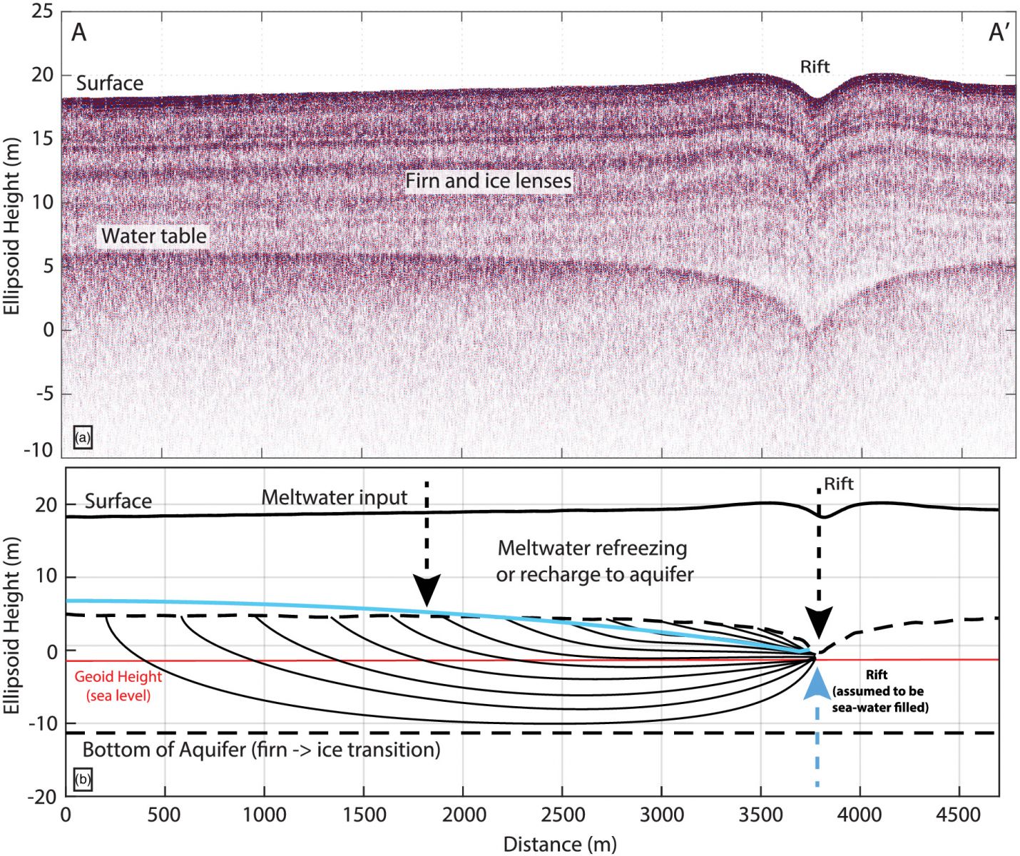 Though it is less dense than brine, freshwater has also destabilized the Wilkins Ice Shelf. Since the 2009 study, using newer remote sensing tools, researchers have ascertained that large areas of the Wilkins Ice Shelf’s firn layer are likely filled with fresh meltwater, creating what is known as a firn aquifer. Firn aquifers are not uncommon on mountain glaciers in warmer climates, but were only discovered on ice sheets in 2011. Fieldwork on the shelf in December 2018 confirmed the presence of a firn aquifer containing substantial quantities of liquid water. Besides providing space for water to fill, firn can provide sufficient insulation to keep water above freezing throughout the winter. As explained in a 2020 paper, the 2018 fieldwork uncovered evidence that meltwater percolated through the firn, and could move several kilometers laterally and drain into rifts. With a mobile (laterally flowing) layer of water above sea level, firn aquifers can have the same fracturing effect as melt ponds. As of 2021, this is currently the best explanation for the series of Wilkins disintegrations in the early 2000s.