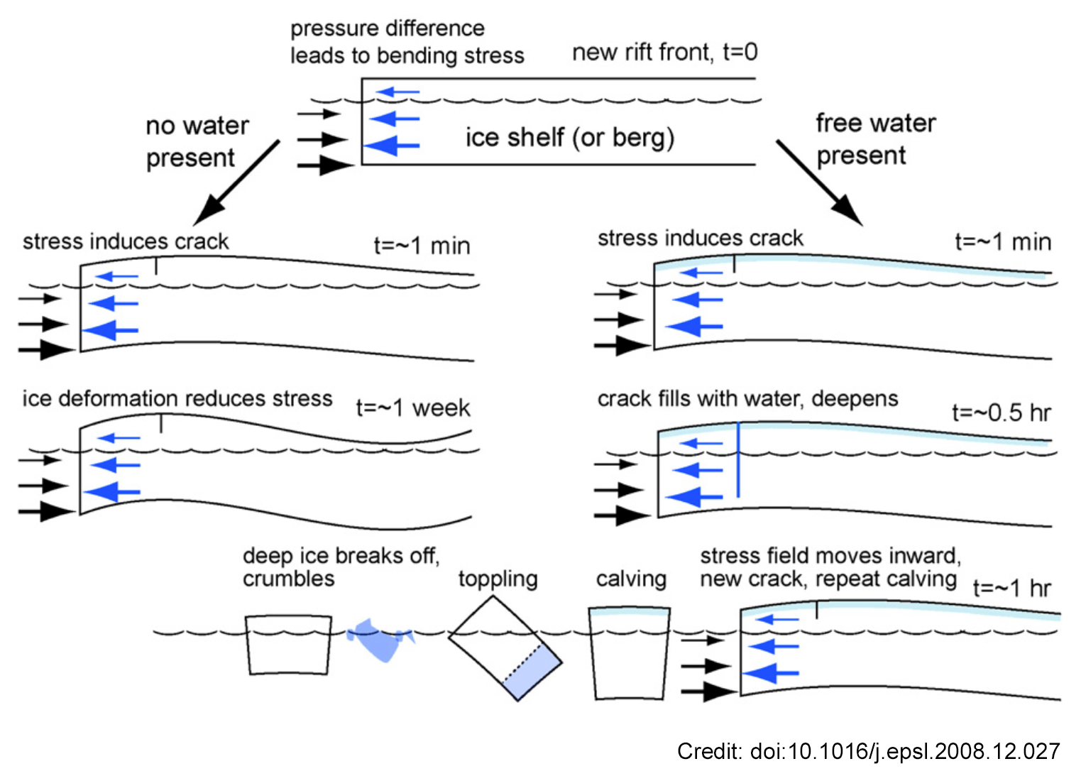 In the short term, what happens after the shelf is deformed by buoyant force on the front depends on the presence or absence of a surface (or near-surface) water layer. In the presence of the water layer, the ice shelf can begin to rapidly disintegrate as the water finds and fills cracks formed by the shelf’s flexing. In the absence of a water layer, the shelf front is stabilized in the short term, but the ice shelf changes shape.