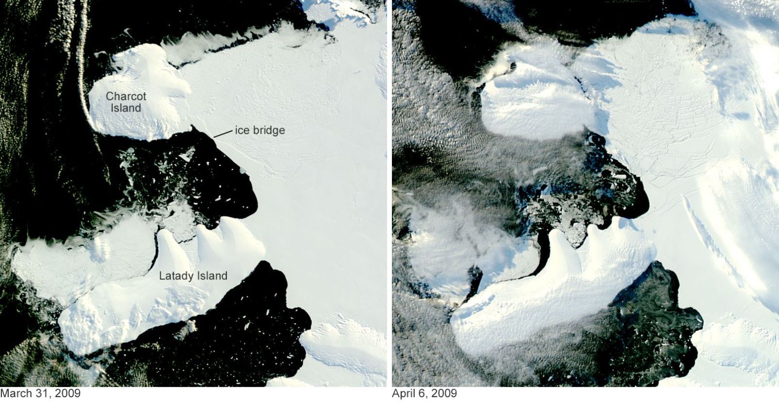 The remaining ice bridge to Charcot Island splinters. MODIS observations can narrow down the date of the break, but not the precise moment, due to intervening cloud cover. When the MODIS sensor on NASA’s Terra satellite passes overhead on March 31, 2009, the ice bridge remains intact. When the MODIS sensor on NASA’s Aqua satellite passes overhead on April 6, 2009, the ice bridge has broken.