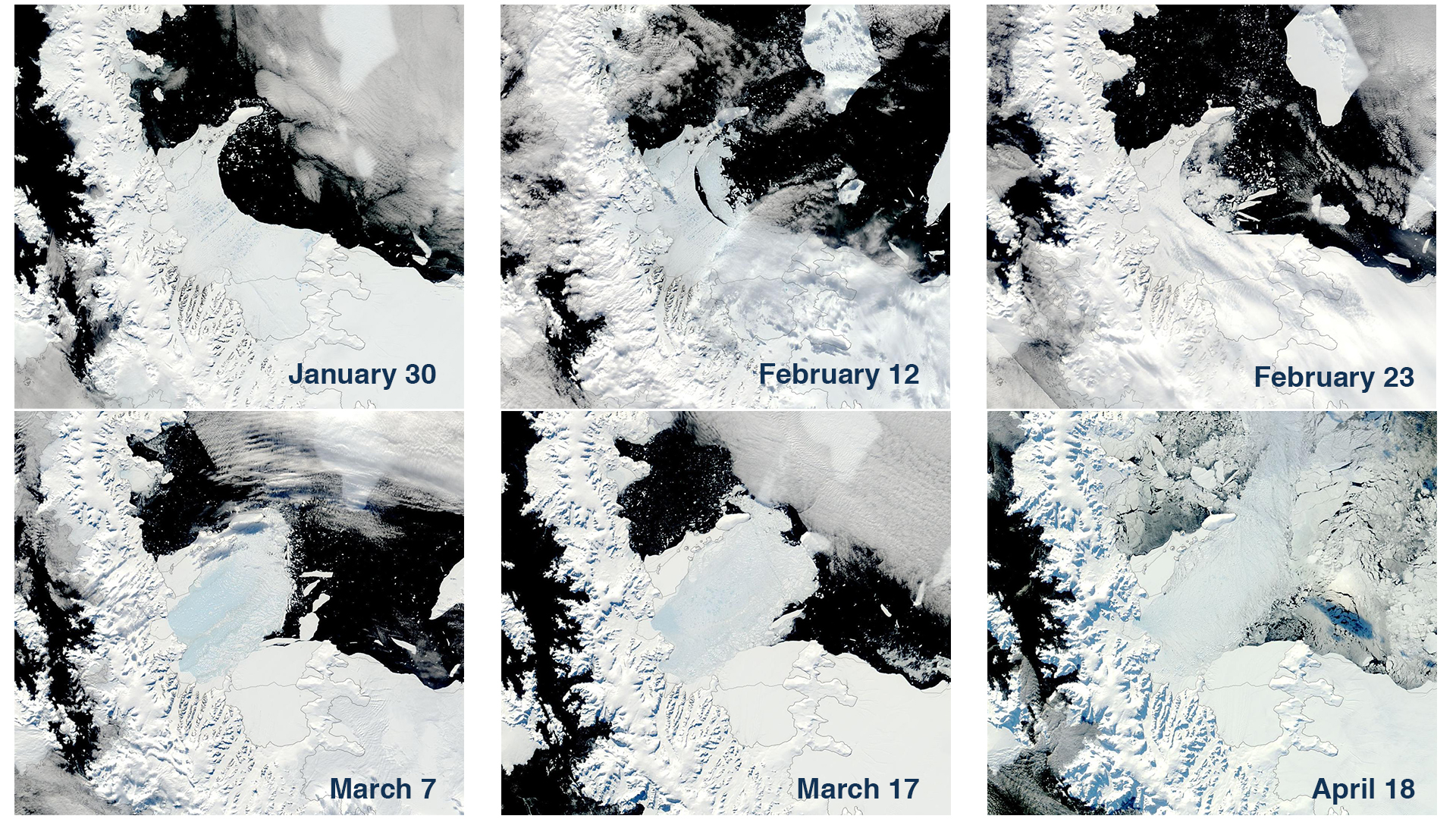 Scientists attributed rapid ice shelf collapse to warmer air and water temperatures, as well as increased melt on the ice shelf surface. Retreating sea ice may also play a role.