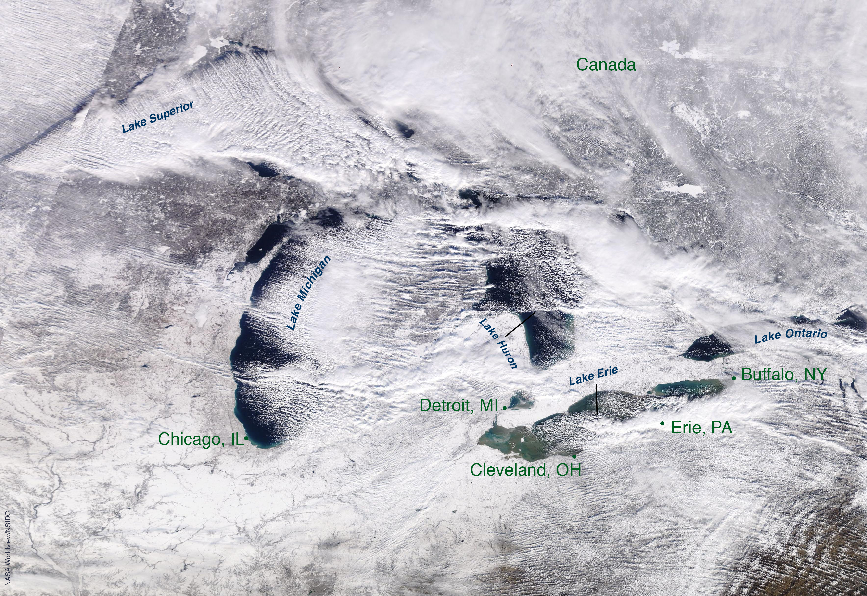 On December 25, 2017, parallel rows of clouds known as cloud streets drifted over the Great Lakes. Erie, Pennsylvania, got a record 152 centimeters (60 inches) of snow over a two-day period. Large contrasts in surface air and lake water temperatures can produce street cloud formations that deliver heavy lake-effect snows downwind of the lakes. — Credit: NASA Worldview/NSIDC