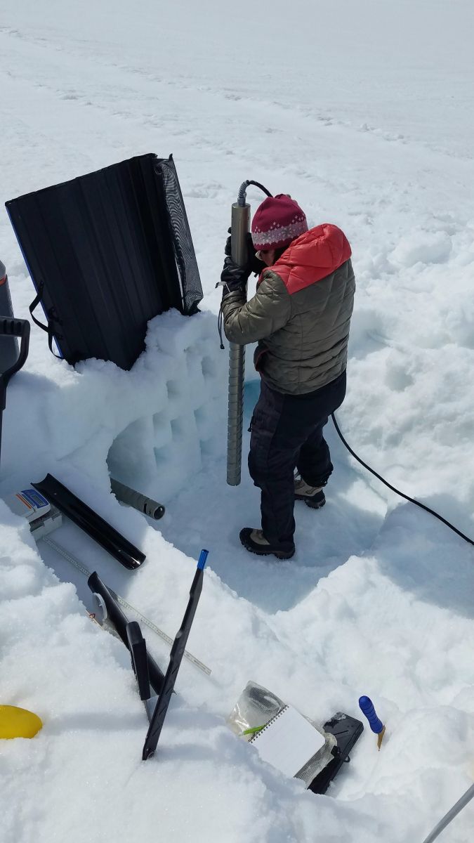 NSIDC researcher Lora Koenig drills into the snow and ice in Iceland to better understand Martian ice from analyzing ice on Earth. — Credit: Lora Koenig