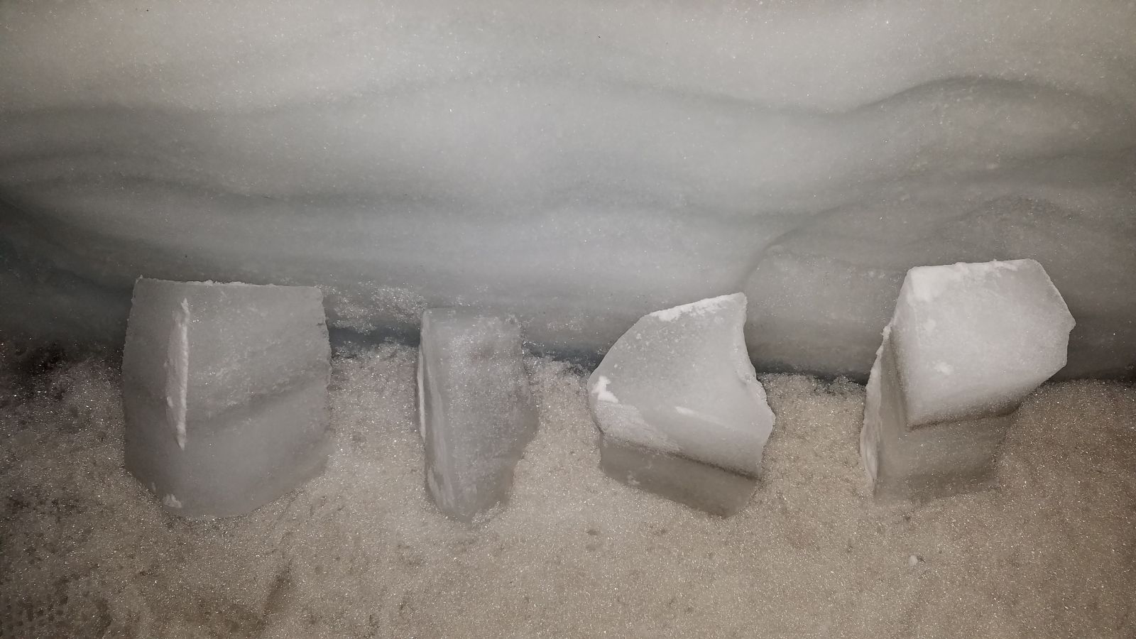 Chunks of Icelandic ice show layers of dust. Radars can image these preserved changes in snow and ice layers. The dark layers in the right two pieces of ice are from volcanic eruptions that spew ash into the atmosphere, which is then deposited and stored in glaciers and ice sheets. — Credit: Lora Koenig