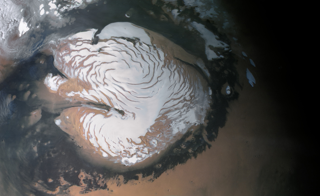 Liquid water cannot exist on the surface of Mars, unless in briny form, because of the planet’s low atmospheric pressure and surface temperature. But a combination of frozen water and carbon dioxide covers both of its polar caps. Since Mars and Earth have a similar axis tilt, they have similar seasons. On the Martian poles, blackout winters sweep in carbon dioxide as snowfall, which vaporizes come spring. In its North Pole, frozen carbon dioxide grows one meter thick in winter, while the much colder South Pole has a permanent dry ice cover up to eight meters thick. That is why Koenig is looking to the north, where ice water dominates.