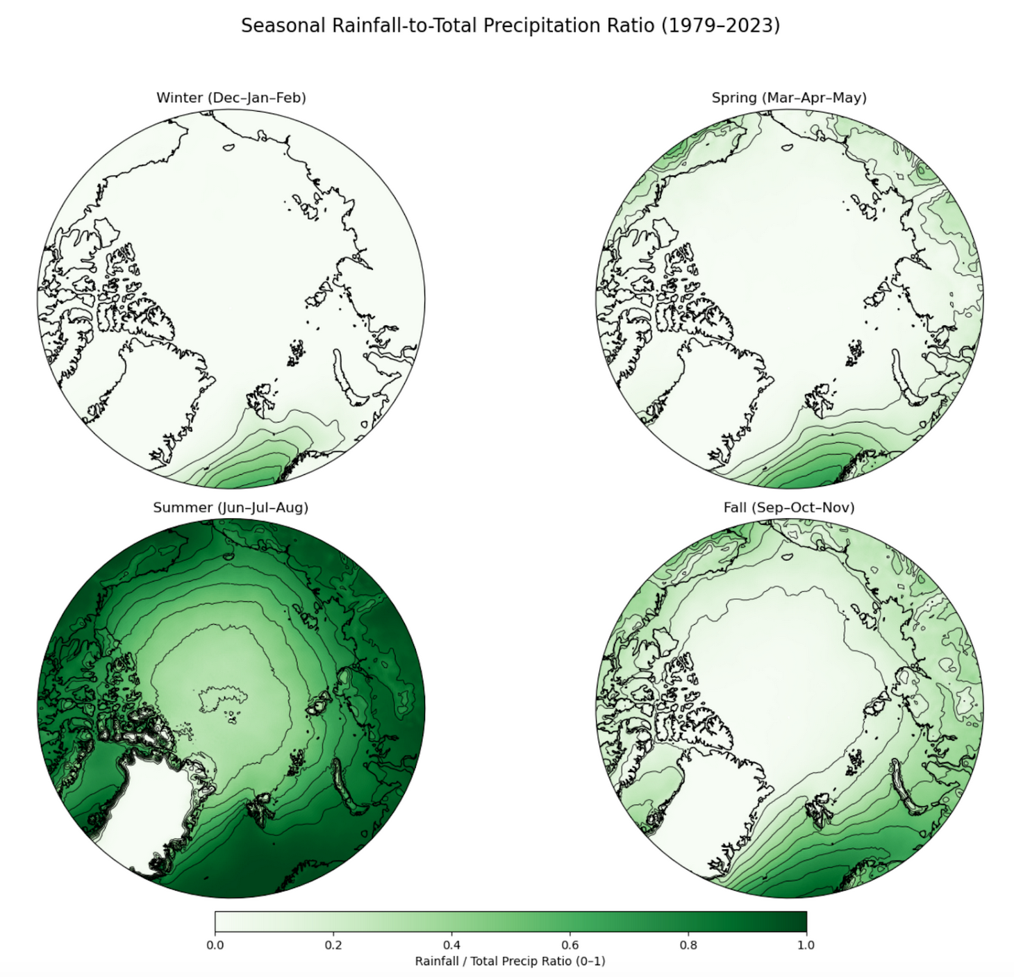 A new study from the AROSS project zooms out for an Arctic-wide perspective on how often precipitation falls as snow or rain, and how snow-to-rain ratios are changing. Although overall trends are apparent, changes vary by location and season.