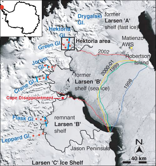 Prior to 2002, the Larsen B Ice Shelf had clung to the Antarctic Peninsula since the last major glaciation 12,000 years ago. Now the peninsula, a mountainous, wispy tail on Antarctica, is a hotspot for global warming. Since 1940, it has been warming 0.5 degrees Celsius (0.9 degrees Fahrenheit) per decade, one of the fastest regional rates observed. In recent years, however, summers have been cool, and a layer of frozen seawater, called fast ice, has filled the gap of the collapsed portion of Larsen B.