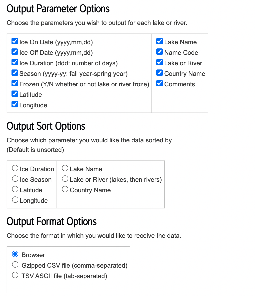 This screenshot from the database query tool shows some options available for output. Users can customize which parameters display, and how to sort the records. — Credit: NSIDC