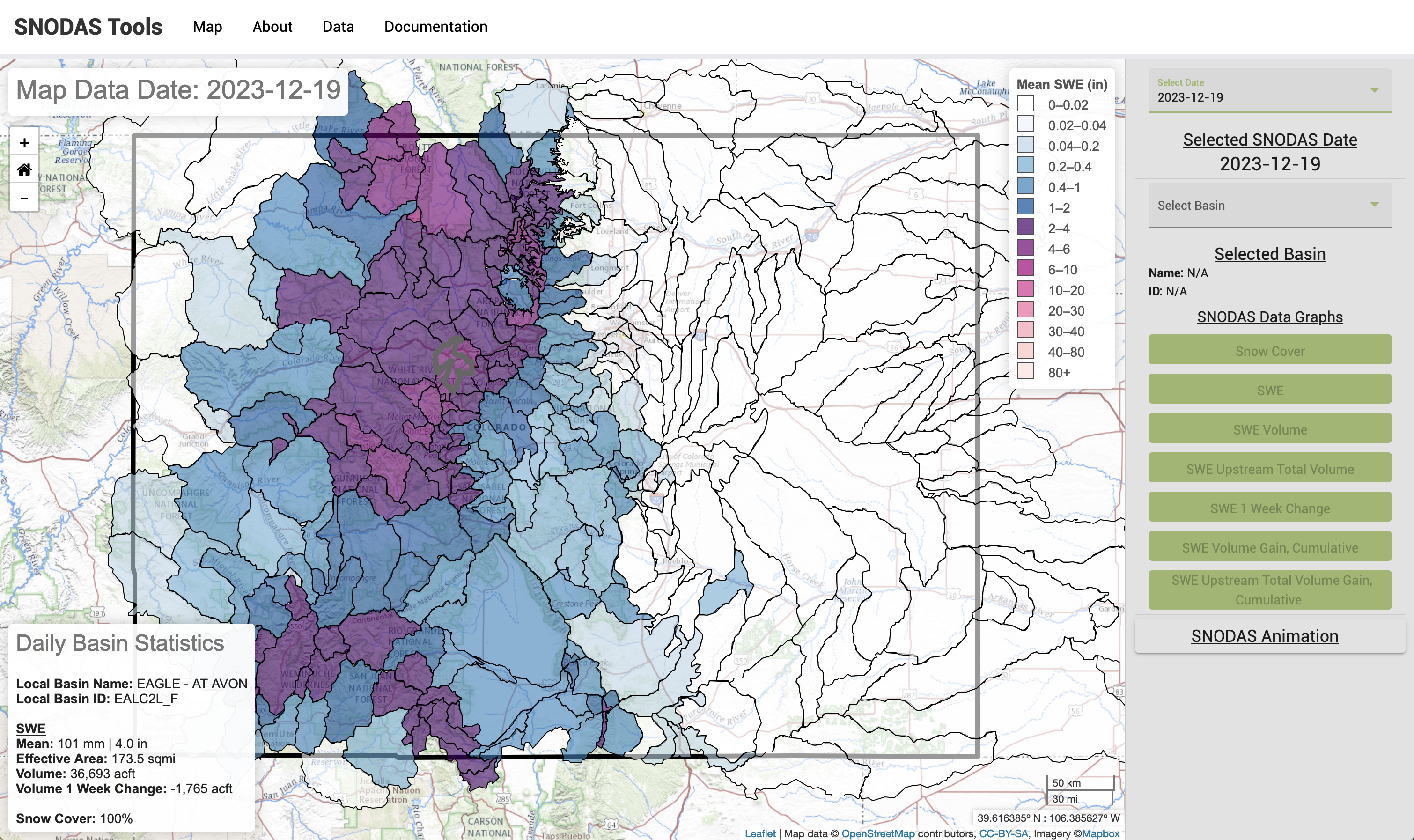 The SNODAS Tools website provides access to a historical archive of SNOw Data Assimilation System (SNODAS) data products for Colorado water supply basins, offering snow water equivalent values in a given water supply basin. — Credit: Open Water Foundation