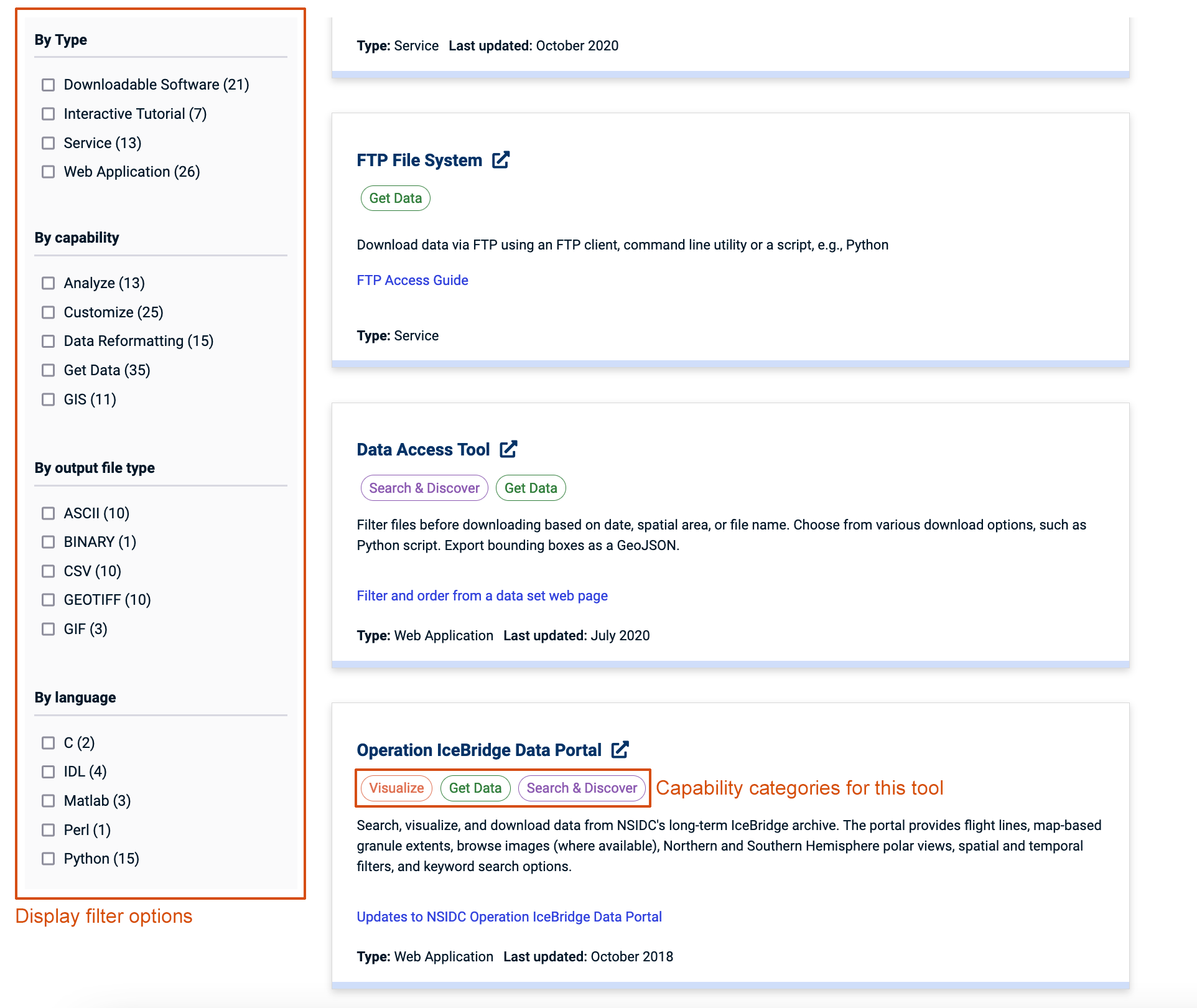 NSIDC’s Data Tools catalogue provides the main portal to the tools NSIDC offers—roughly 60 different offerings—and the page’s display can be filtered by the tool type, capability, output file type, and coding language. Each tool displayed shows its capability categories, allowing users to search by data-use function.