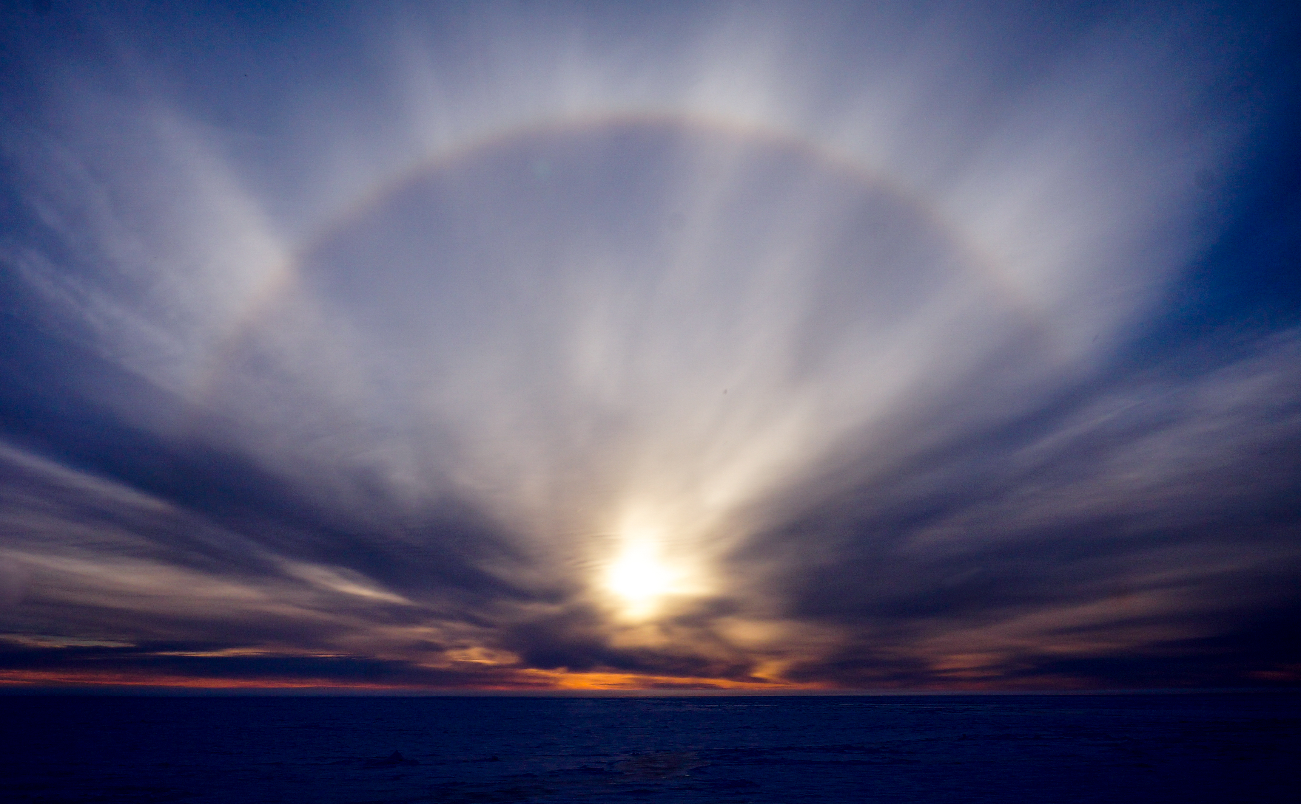 A halo occurs around the sun when light is refracted as it passes through ice crystals and produces a very well-defined ring of light around the sun. This is different from a corona whose ring is created when light is diffracted through small droplets of liquid water in clouds. When a thin uniform cirrostratus cloud deck containing ice crystals covers the sky, the halo may be in the form of a complete circle.