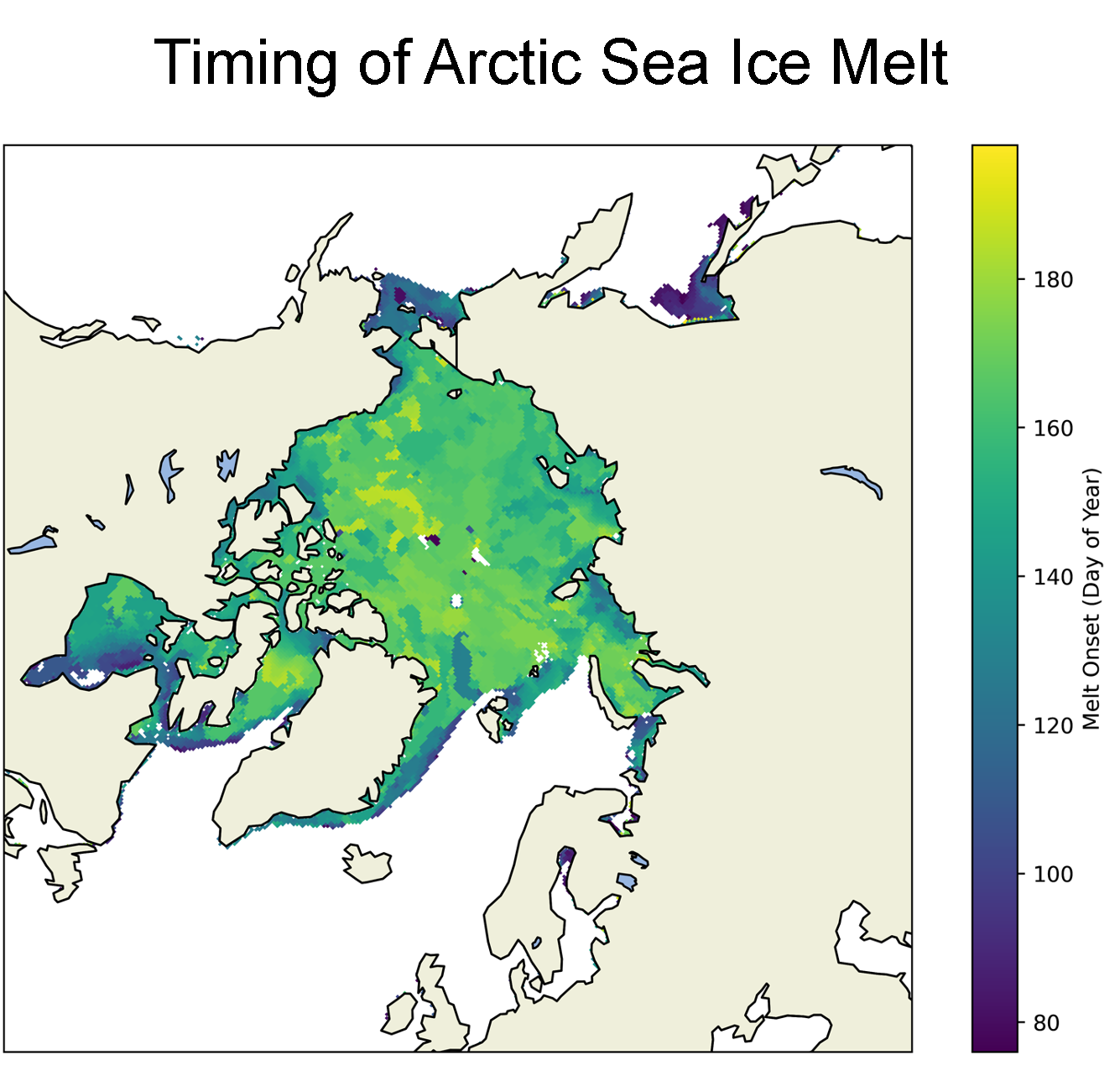 Figure 3a. This map shows the date of sea ice melt onset in the Arctic for the 2024 melt season. Shades in purple depict early melt, while shades in yellow depict melt later in the season. — Credit: J. Strove, NSIDC; data courtesy J. Miller and L. Boisvert, NASA Goddard