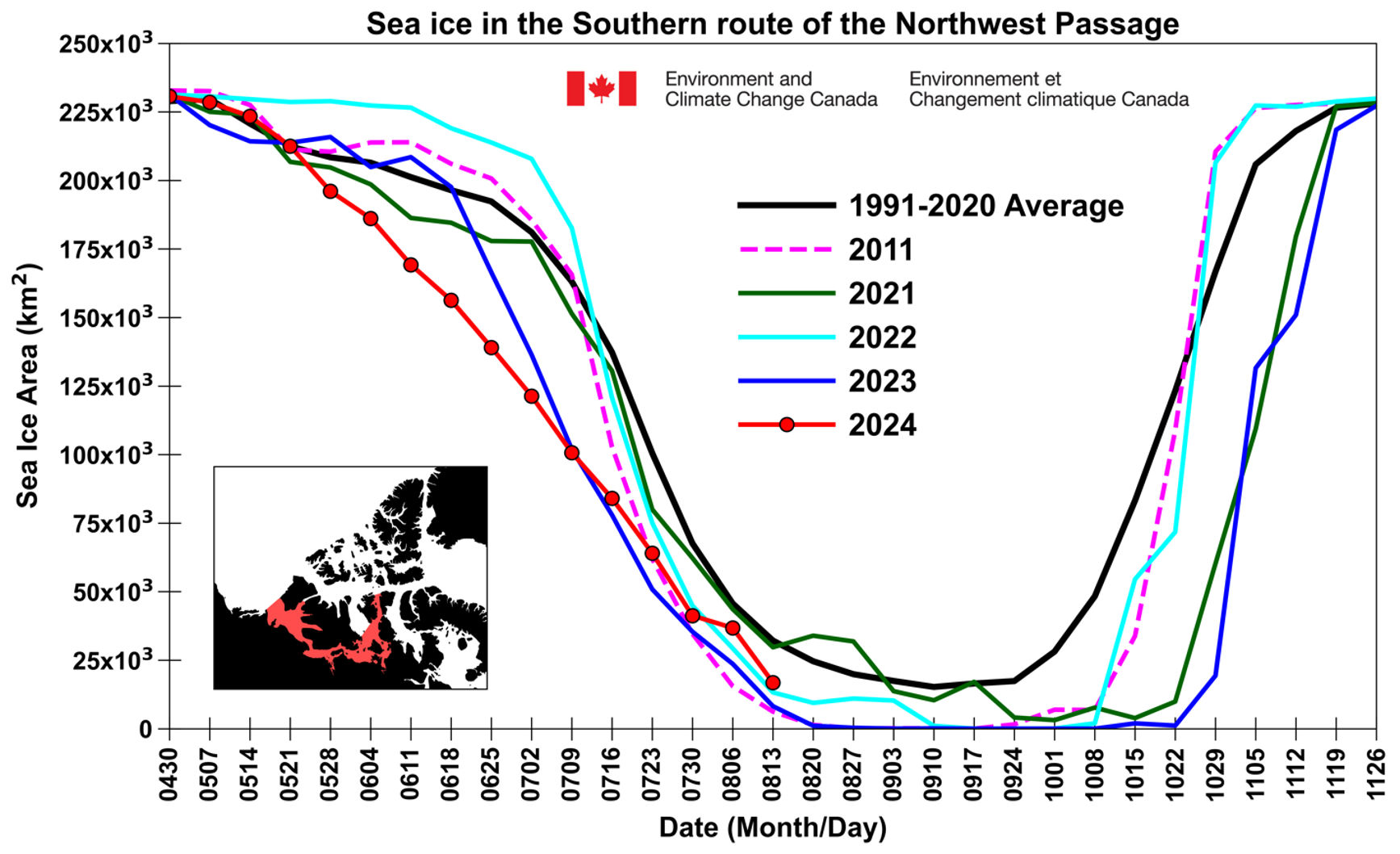 Figure 4b. The time series shows total sea ice area for 2024, 2023, 2022, 2021, 2011, and the 1991 to 2020 average within the southern route of the Northwest Passage. Data is from the Canadian Ice Service. — Credit: Howell, Environment and Climate Change Canada