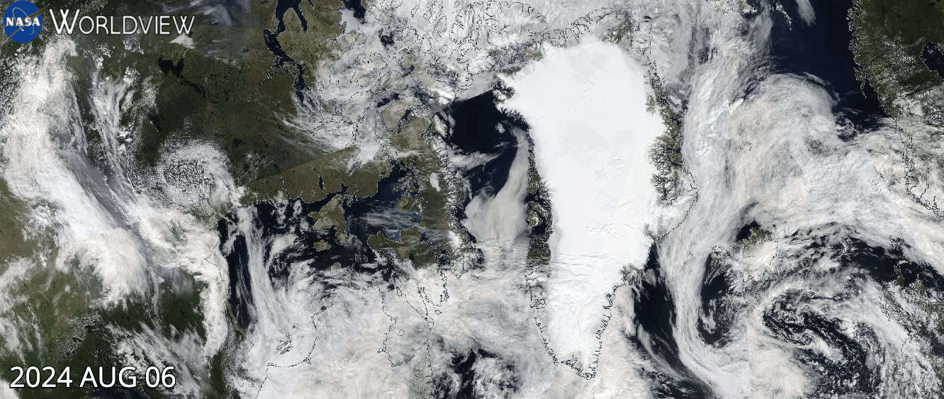 Figure 5. Click to animate. This NASA Worldview image shows how smoke from Canadian wildfires moved through the Arctic from August 6 to 18, 2024. — Credit: NASA Worldview