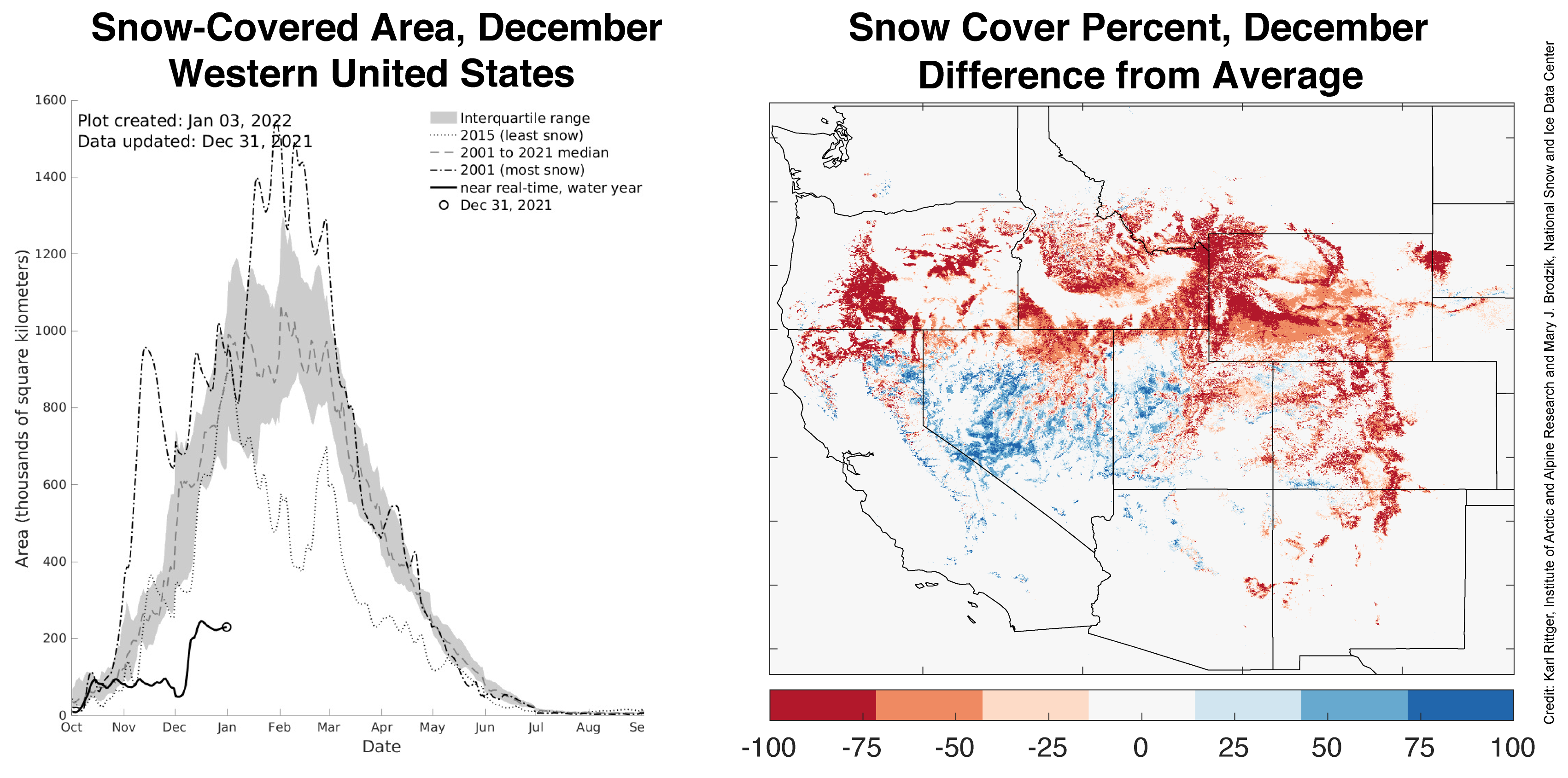 Averaged over the western United States, the number of snow cover days from October 1 to December 31 was a new record low since the start of the satellite record in 2001 (Figure 3, right). The previous record low in snow cover days was set in December 2020, hence December 2021 marks the second consecutive year with exceptionally low snow cover days. The year with the lowest snow cover through the full season was 2015, but snow cover days at the end of December was still greater that year than in 2021.
