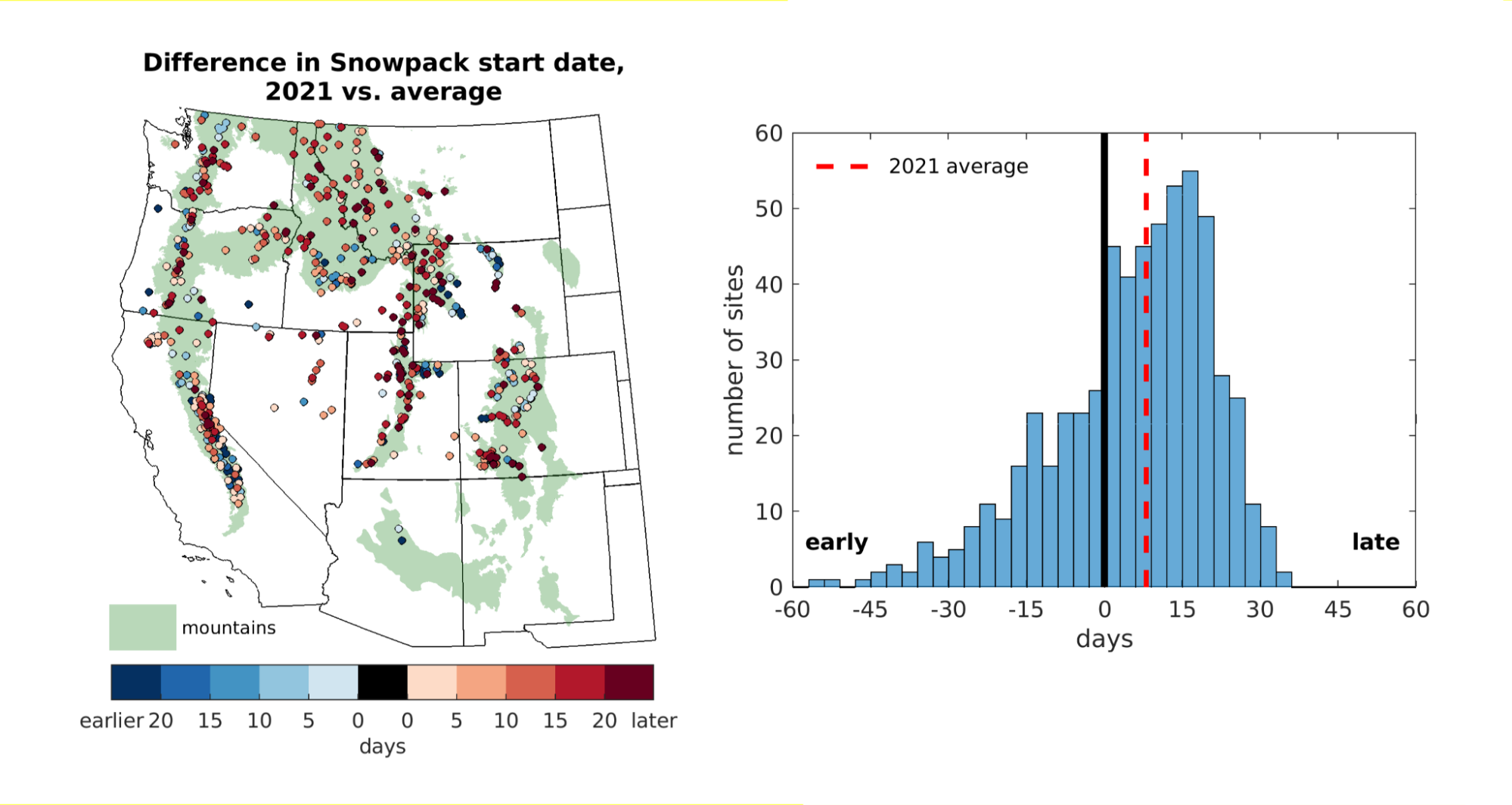 • The snowpack began developing at SWE stations 8.0 days later than average in 2021.