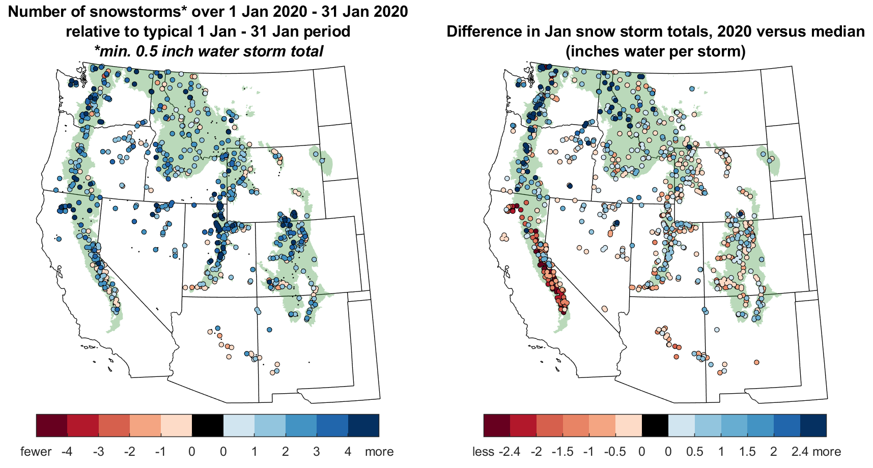 Figure 2d. The left map shows the number of snowstorms delivering greater than 0.5 inches of water in January 2020. Many locations had more snowstorms in January 2020 than an average January. The right map shows the water delivery of January snowstorms, comparing 2020 snow totals to median snow totals in January. The magnitude of snowstorms was above average in the northwest and below average to the south, helping explain changes in SWE patterns through January (Figure 2b). The green shading delineates mountainous areas, as represented in Environmental Protection Agency (EPA) data. — Credit: M. Raleigh, National Snow and Ice Data Center (NSIDC)