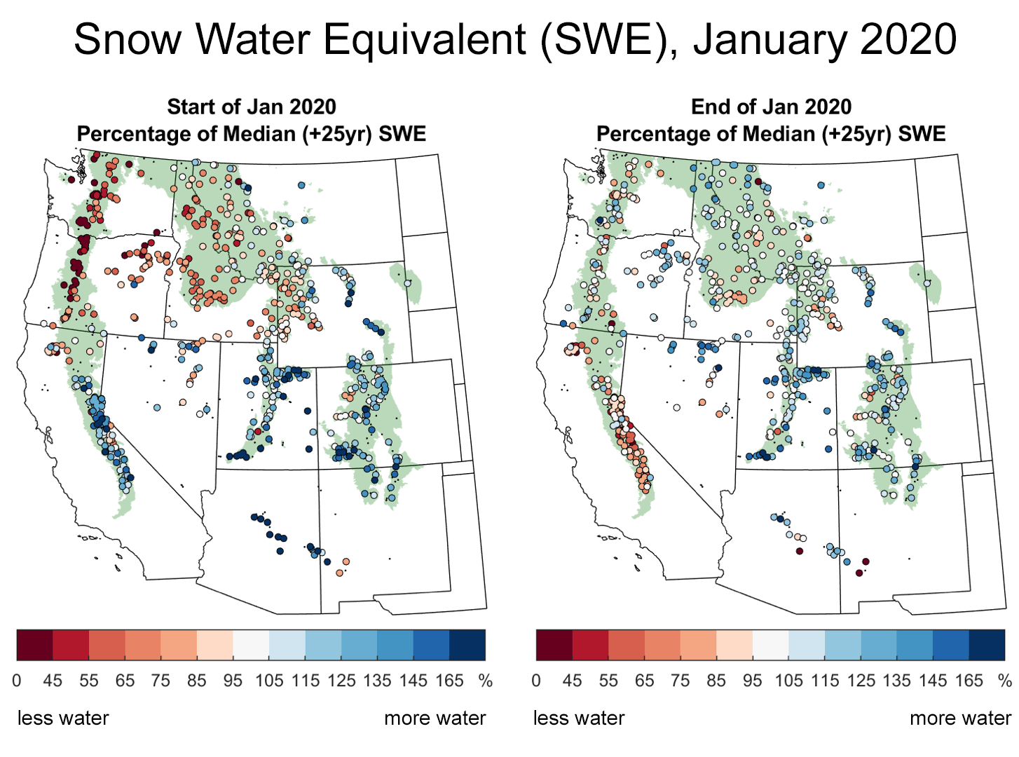 Figure 2b. These maps show Snow Water Equivalent (SWE) at monitoring sites at the start and end of January 2020. SWE is expressed as percent of median conditions for the start and end of January at each site, with warmer colors indicating below average SWE, or less water, and cooler colors indicating above average SWE, or more water. The green shading delineates mountainous areas, as represented in Environmental Protection Agency data. — Credit: M. Raleigh, National Snow and Ice Data Center (NSIDC)