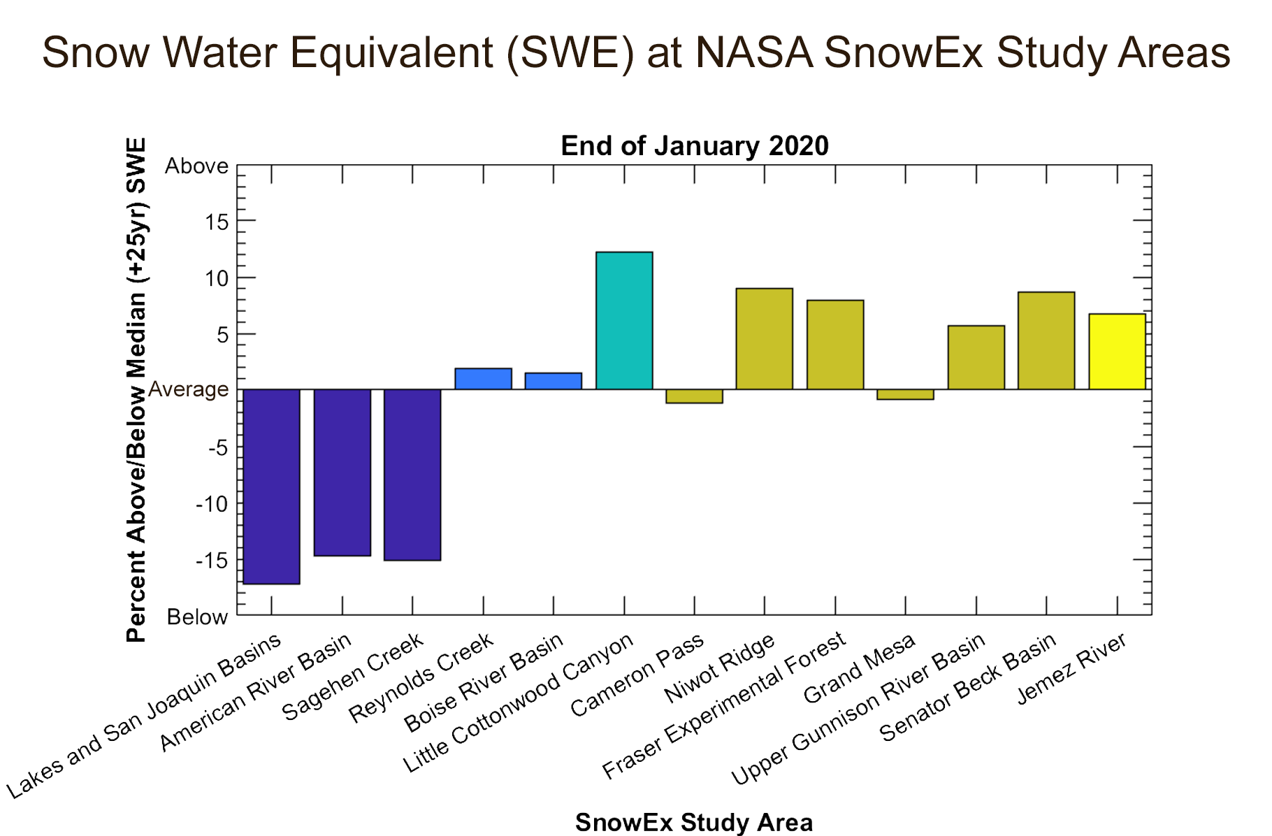 Figure 3a. This chart shows Snow Water Equivalent (SWE) above and below average snowpack conditions at 13 NASA SnowEx study areas at the end of January 2020. SWE is expressed as percent of the long-term median value at nearby snow pillow sites from the full National Resources Conservation Service (NRCS) Snow Telemeter (SNOTEL) and California Department of Water Resources (DWR) snow pillow networks, weighted by proximity to each study area. Common colors denote different states, from left to right California, Idaho, Utah, Colorado, and New Mexico. — Credit: M. Raleigh, National Snow and Ice Data Center (NSIDC)