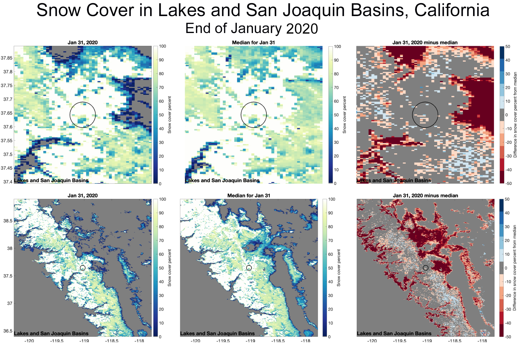 Figure 3b. These maps show snow cover in the vicinity of the Lakes and San Joaquin Basins of California, a SnowEx study area, at the end of January. The top row zooms in while the bottom zooms out on the area. The left maps show snow cover area on January 31, 2020, the middle maps show median snow cover on January 31 over the 2001 to 2019 period, and the right maps show the difference between 2020 and the median 2001 to 2019 period. In the right maps, cool colors indicate more snow cover in 2020 than the 2001 to 2019 period while warm colors indicate less snow cover in 2020.  — Credit: K. Rittger, Institute of Arctic and Alpine Research (INSTAAR)