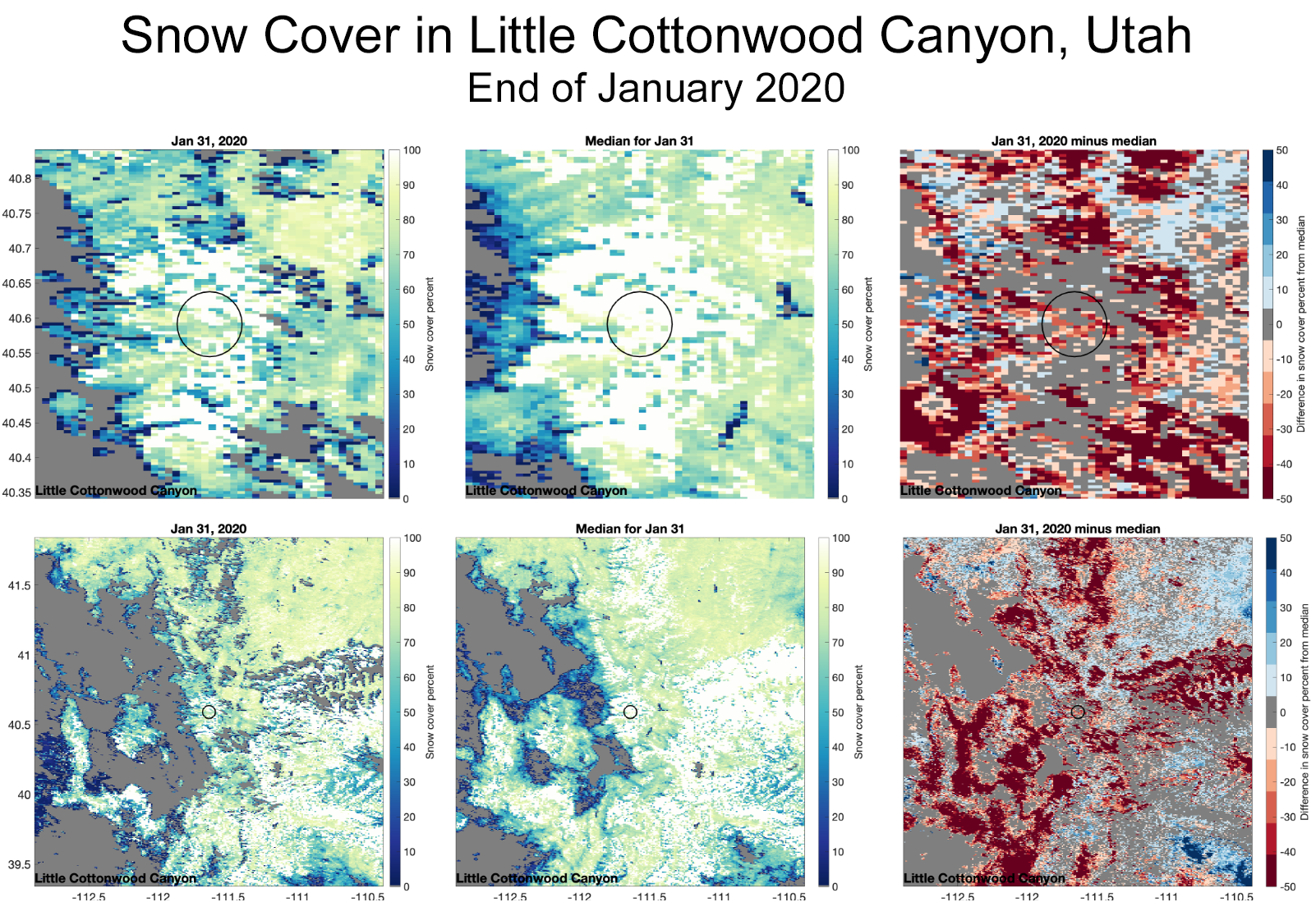 Figure 3d. These maps show snow cover in the vicinity of Little Cottonwood Canyon, Utah, a SnowEx study area, at the end of January. The top row zooms in while the bottom zooms out on the study area. The left maps show snow cover area on January 31, 2020, the middle maps show median snow cover on January 31 over the 2001 to 2019 period, and the right maps show the difference between 2020 and the median 2001 to 2019 period. In the right maps, cool colors indicate more snow cover in 2020 than the 2001 to 2019 period while warm colors indicate less snow cover in 2020.  — Credit: K. Rittger, Institute of Arctic and Alpine Research (INSTAAR)