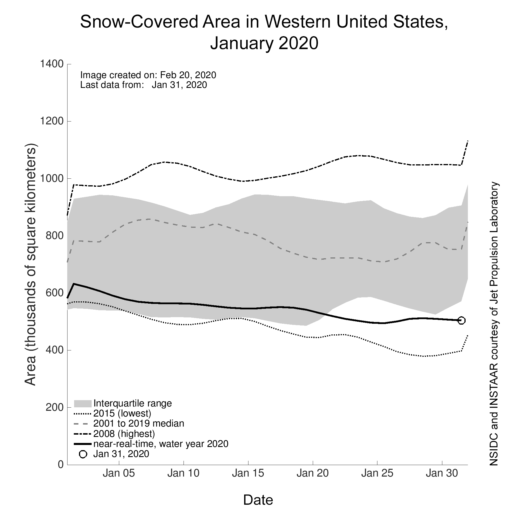 As averaged for January 2020, snow-covered area for the Western United States was 533,000 square kilometers (206,000 square miles) (Figure 1a). This was the sixth lowest snow cover in January in the NASA Moderate Resolution Imaging Spectroradiometer (MODIS) satellite record that started in 2001. For comparison, there was 261,000 square kilometers (101,000 square miles) less snow-covered area in January 2020 than the average computed over the 2001 to 2019 reference period. The January with the greatest snow cover since 2001 was in 2008, when an average of 1.03 million square kilometers (398,000 square miles) blanketed western North America, 496,000 square kilometers (191,000 square miles) more than in 2020. The January with the least snow cover since 2001 occurred in 2018, when snow dusted an average of only 396,000 square kilometers (153,000 square miles), 137,000 square kilometers (53,000 square miles) less than 2020. Comparing January to the same month a year ago, there was 170,000 square kilometers (66,000 square miles) less snow cover in January 2020 than in January 2019. Through January 2020, the lowest daily snow coverage was 482,000 square kilometers (186,000 square miles) occurring on January 25, 2020, while the highest daily snow coverage was 625,000 square kilometers (241,000 square miles) occurring on January 1, 2020.