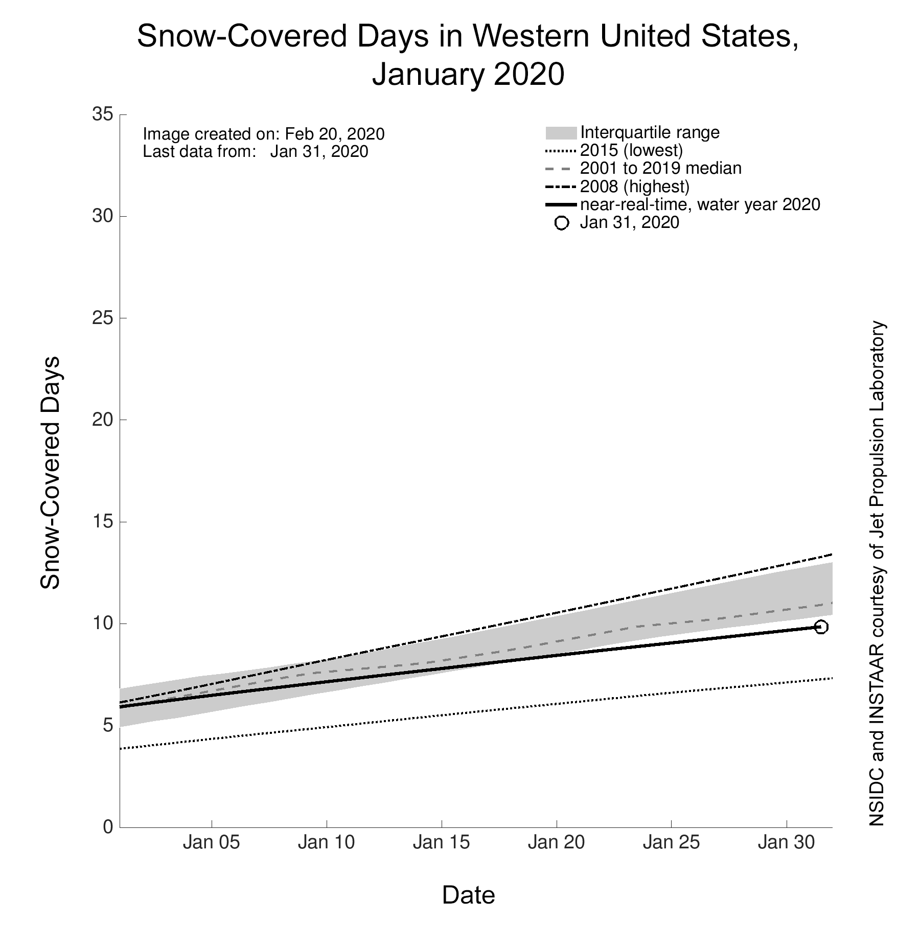 Between the start of the water year on October 1, 2019 and the end of January 2020, there were 9.8 snow-covered days when averaged over elevations greater than 1,200 meters (3,900 feet) in the Western United States (Figure 1b). Over that domain, there were six snow-covered days at the start of January 2020, on par with the 2001 to 2019 average at the start of January. By the end of January 2020, there were 1.1 fewer snow-covered days than the 2001 to 2019 average at the end of January. From the start to the end of January, the current year had a weaker increase in snow-covered days, relative to more average years.