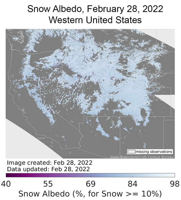 After a dry January, early February also had little snowfall with considerable snow melt (Figure 4, left). In this period, the snow albedo was low (Figure 1, left) because the snowpack was not refreshed by bright new snow; as a result, the snowpack absorbed more solar energy and thus melted quickly across the western United States. Mid-month storms broke this pattern with snow-covered area briefly increasing and reaching the maximum snow cover since early January. In late February, dry conditions returned, and the snow-covered area decreased to nearly the lowest value in the 22-year satellite record. Hence, there was a “double peak” in maximum snow cover for the 2021 to 2022 snow year, with the late February peak having slightly more snow-covered area than the early January peak.