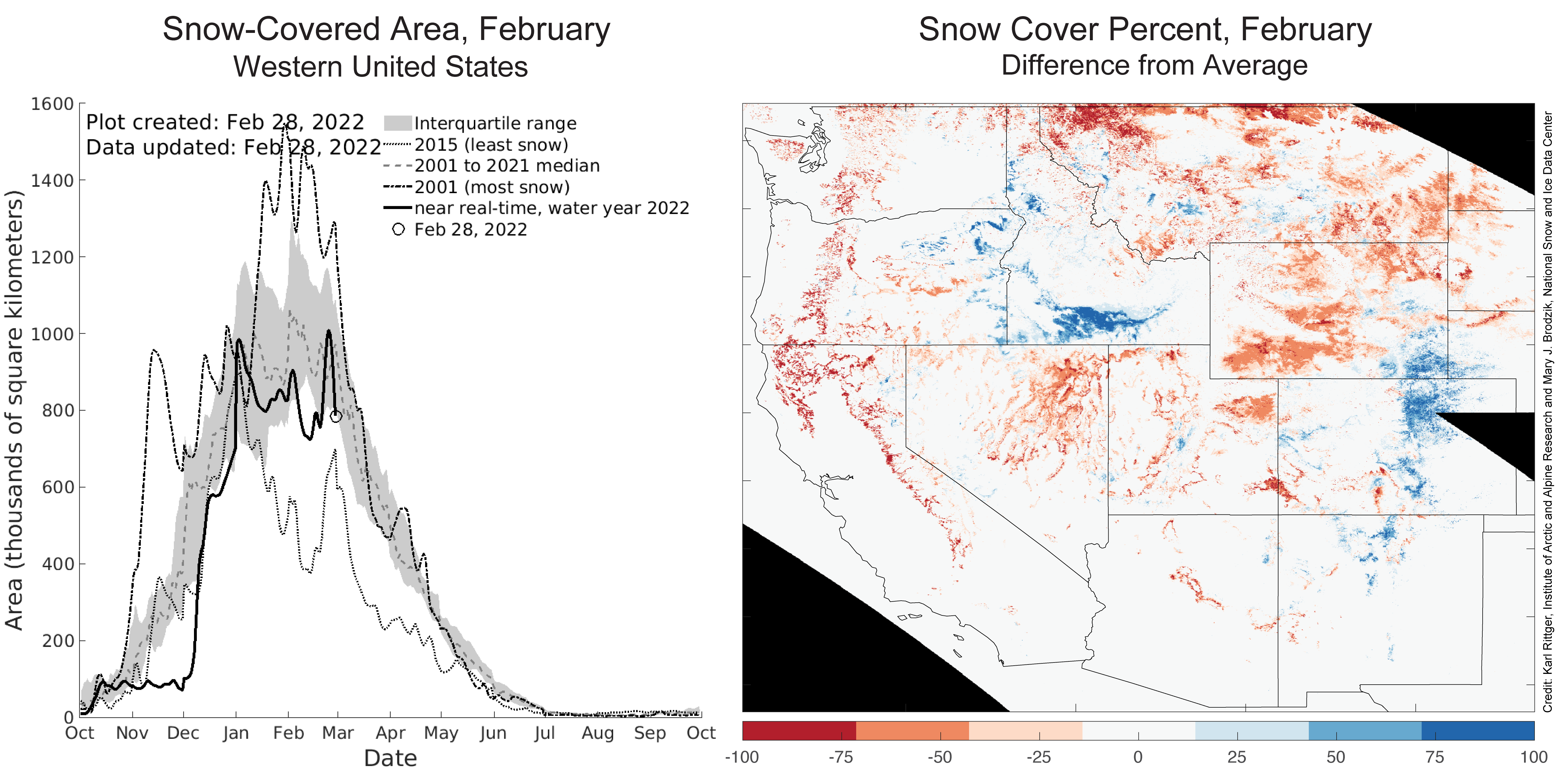 Across the western United States, most regions had below-average snow-covered areas throughout the month of February (Figure 4, right). A few regions had above-average snow-covered areas, like southern Idaho and eastern Colorado (Front Range), indicating continuations of the previous month’s pattern in these regions. New Mexico also had above-average snow cover conditions in February, breaking the local pattern that persisted from December through January. Montana exhibited the largest snow deficit among the western states, notably in the northern part of the state.