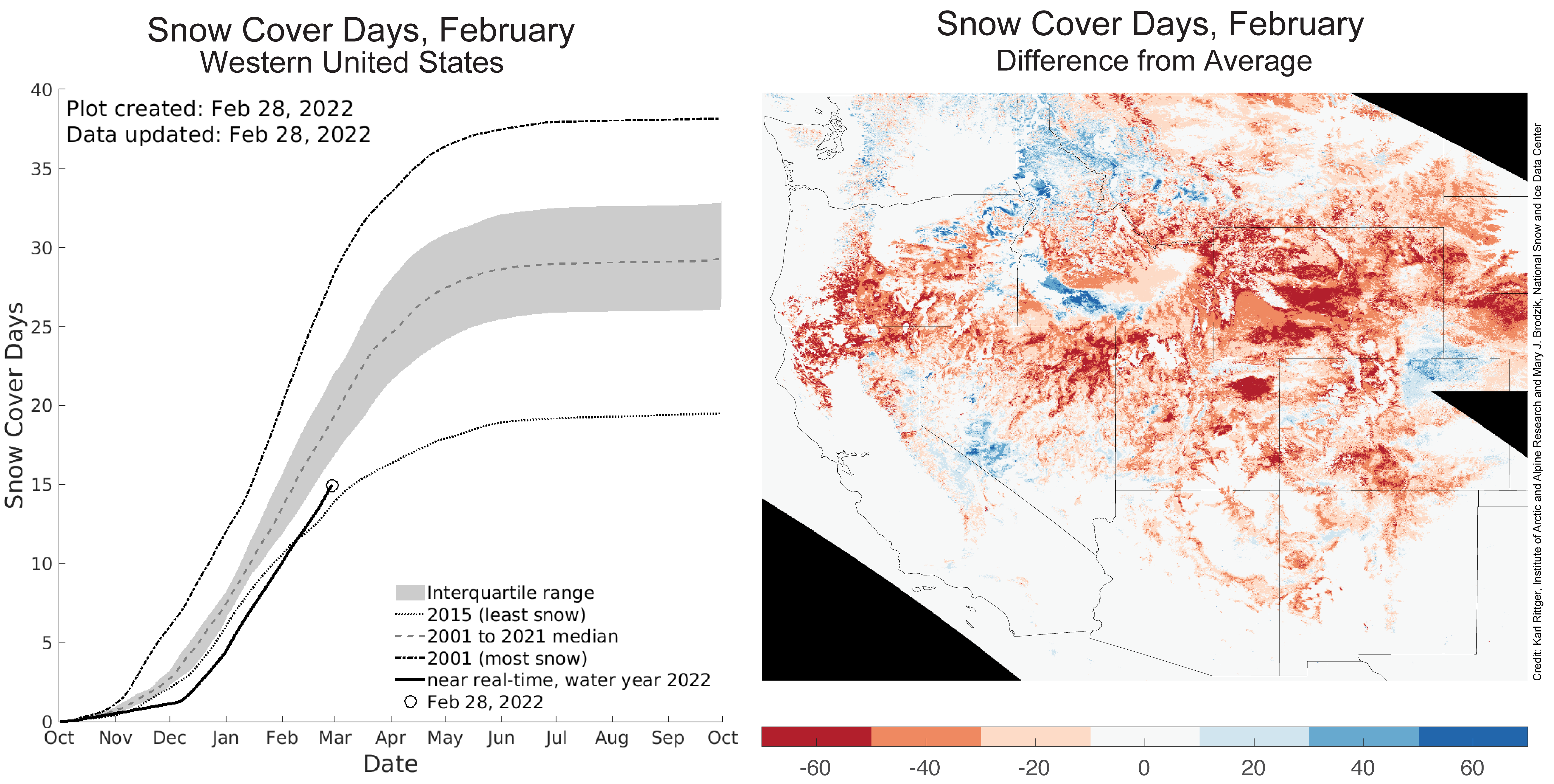 Averaged over the western United States, the number of snow cover days from October 1 to February 28 began below the 2015 minimum in the 22-year satellite record but the trajectory changed in early February, with snow cover days surpassing the 2015 minimum (Figure 5, left). Changes in the trajectory of snow cover days are not typical but can occur in February, when the cold conditions that often prevail across the western United States can bring snow to relatively low-elevation regions as well as mountain tops. Still, the number of snow cover days this year remains below the interquartile range of the 22-year satellite record. Extensive areas had 40 to 60 fewer snow cover days than average (Figure 5, right). Washington state appears rather balanced, while northern and southern Idaho, the far-western part of Montana, western Nevada, and northeast Colorado contain some isolated areas with more snow cover days than average.