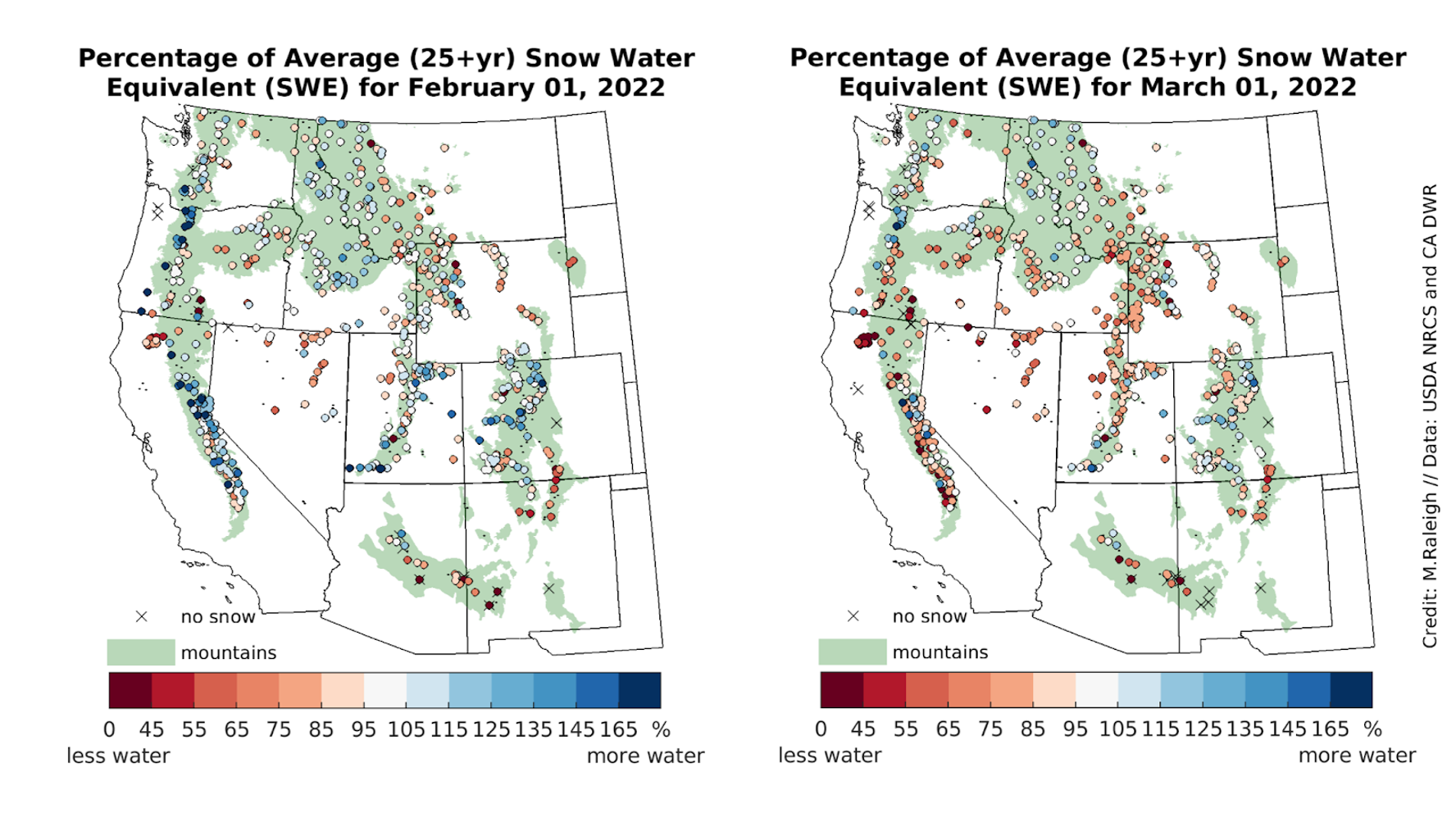 - Snow water equivalent (SWE) was below average at 50 percent of stations on February 1 and at 76 percent of stations on March 1.