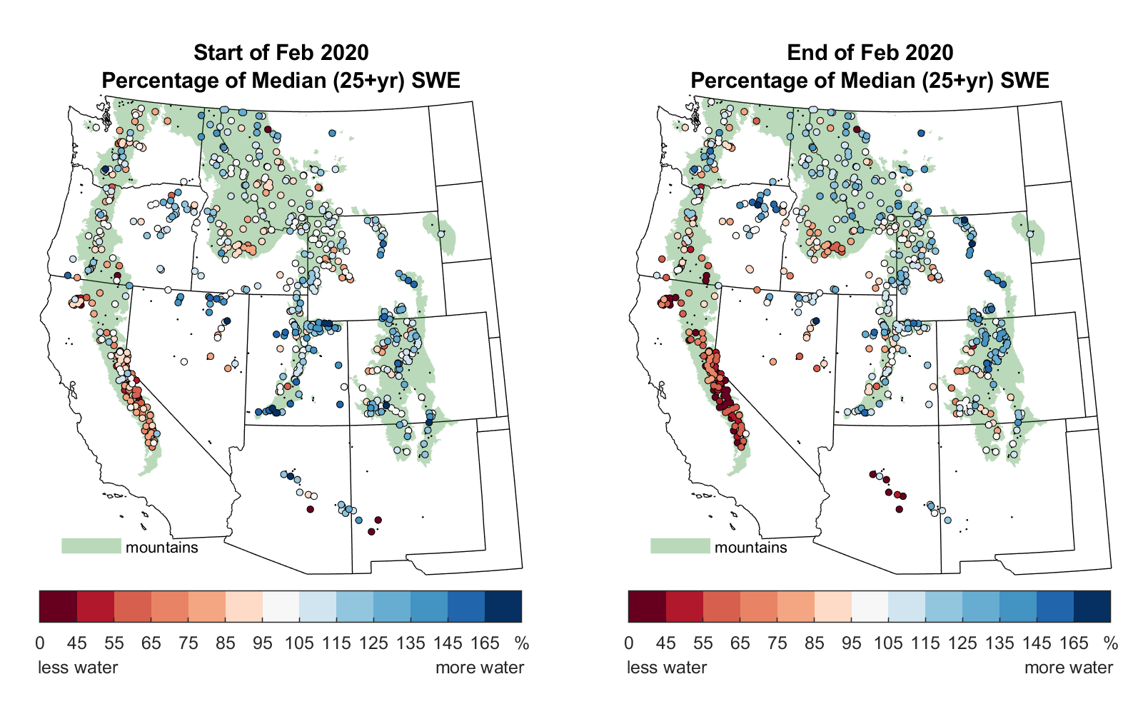 Figure 4. These maps show Snow Water Equivalent (SWE) at monitoring sites at the beginning and end of February 2020. SWE is expressed as percent of average conditions for the beginning and end of February at each site, with warmer colors indicating below average SWE, or less water, and cooler colors indicating above average SWE, or more water. The green shading delineates mountainous areas as represented in Environmental Protection Agency data. — Credit: M. Raleigh, National Snow and Ice Data Center (NSIDC)